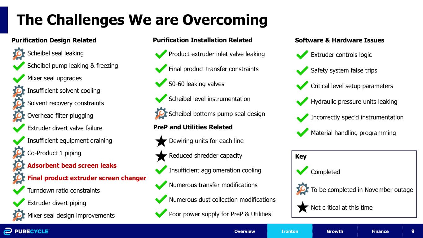 8 Persistent Leaking Beads Took Time to Solve Overview Ironton Growth Finance Prototype #1 Initial Problem Interim Solutions Install automated screen changer during outage Prototype #2: attempted in Oct; Unsuccessful test run and returned back to prototype #1 Solution Purging to remove beads New screen changer is onsite and scheduled for installation during the November outage Beads behind leaking weld Significant bead leakage