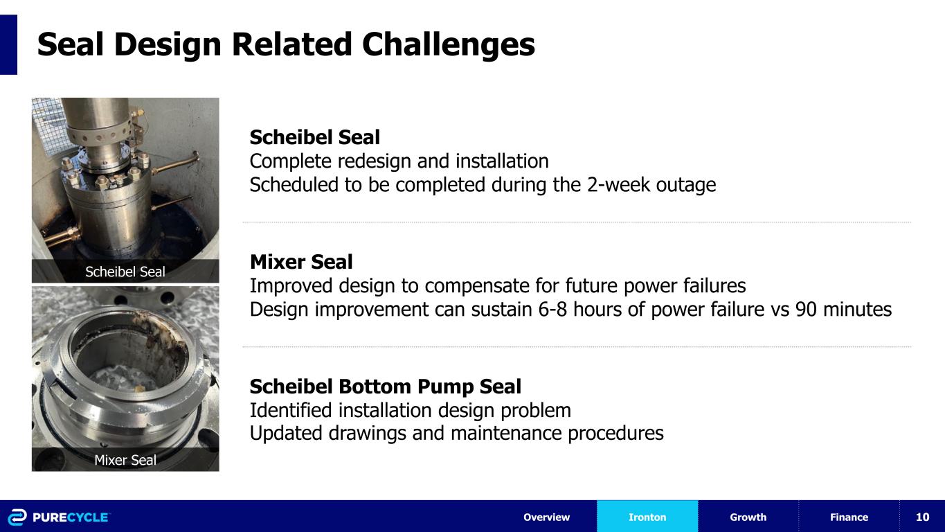 9 The Challenges We are Overcoming Purification Design Related Scheibel seal leaking Scheibel pump leaking & freezing Mixer seal upgrades Insufficient solvent cooling Solvent recovery constraints Overhead filter plugging Extruder divert valve failure Insufficient equipment draining Co-Product 1 piping Adsorbent bead screen leaks Final product extruder screen changer Turndown ratio constraints Extruder divert piping Mixer seal design improvements Purification Installation Related Product extruder inlet valve leaking Final product transfer constraints 50-60 leaking valves Scheibel level instrumentation Scheibel bottoms pump seal design Software & Hardware Issues Extruder controls logic Safety system false trips Critical level setup parameters Hydraulic pressure units leaking Incorrectly spec’d instrumentation Material handling programming PreP and Utilities Related Dewiring units for each line Reduced shredder capacity Insufficient agglomeration cooling Numerous transfer modifications Numerous dust collection modifications Poor power supply for PreP & Utilities Key Completed To be completed in November outage Not critical at this time Overview Ironton Growth Finance