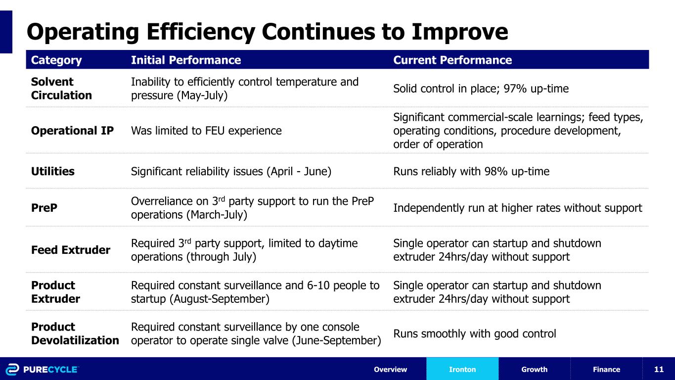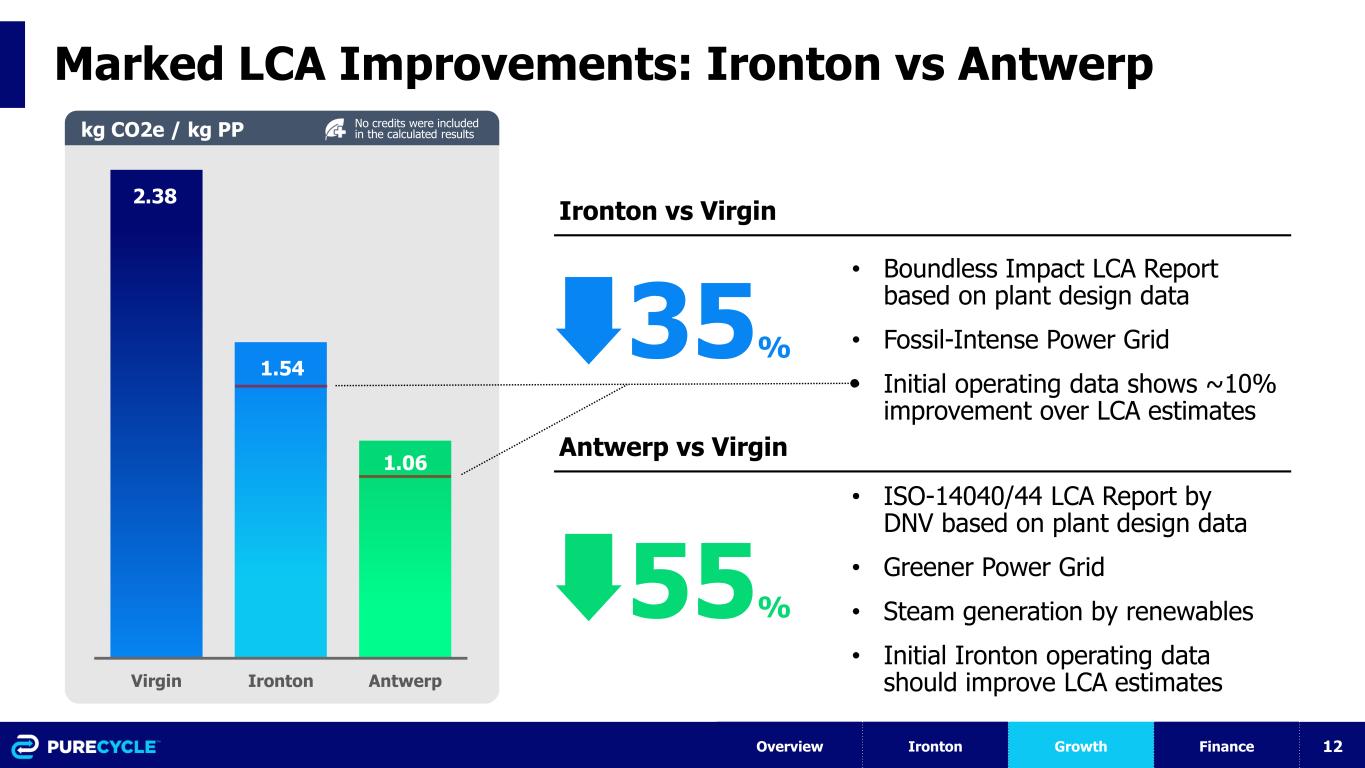 11 Operating Efficiency Continues to Improve Category Initial Performance Current Performance Solvent Circulation Inability to efficiently control temperature and pressure (May-July) Solid control in place; 97% up-time Operational IP Was limited to FEU experience Significant commercial-scale learnings; feed types, operating conditions, procedure development, order of operation Utilities Significant reliability issues (April - June) Runs reliably with 98% up-time PreP Overreliance on 3rd party support to run the PreP operations (March-July) Independently run at higher rates without support Feed Extruder Required 3rd party support, limited to daytime operations (through July) Single operator can startup and shutdown extruder 24hrs/day without support Product Extruder Required constant surveillance and 6-10 people to startup (August-September) Single operator can startup and shutdown extruder 24hrs/day without support Product Devolatilization Required constant surveillance by one console operator to operate single valve (June-September) Runs smoothly with good control Overview Ironton Growth Finance