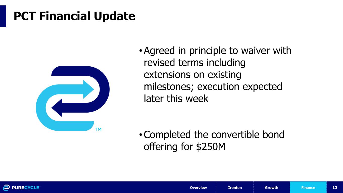 12 Marked LCA Improvements: Ironton vs Antwerp Overview Ironton Growth Finance 2.38 1.54 1.06 Virgin Ironton Antwerp kg CO2e / kg PP 35% 55% Ironton vs Virgin Antwerp vs Virgin • Boundless Impact LCA Report based on plant design data • Fossil-Intense Power Grid • Initial operating data shows ~10% improvement over LCA estimates • ISO-14040/44 LCA Report by DNV based on plant design data • Greener Power Grid • Steam generation by renewables • Initial Ironton operating data should improve LCA estimates No credits were included in the calculated results