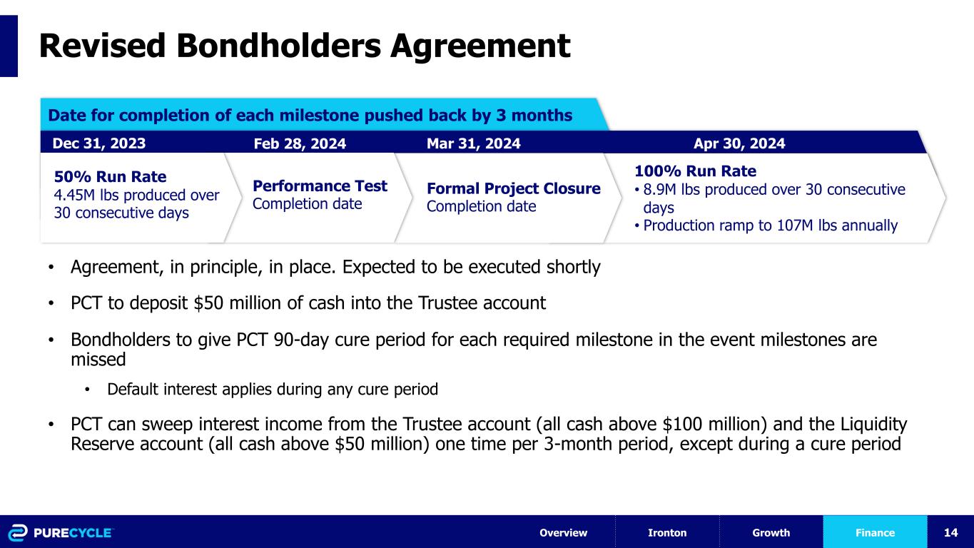 13 PCT Financial Update •Agreed in principle to waiver with revised terms including extensions on existing milestones; execution expected later this week •Completed the convertible bond offering for $250M Overview Ironton Growth Finance