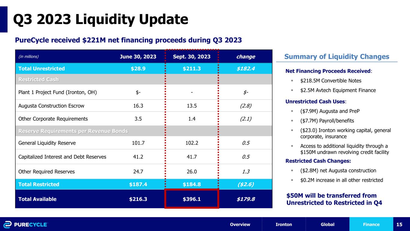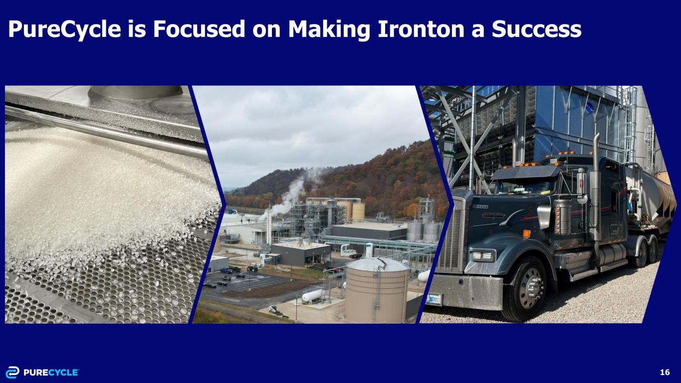 15 Q3 2023 Liquidity Update Net Financing Proceeds Received: ▪ $218.5M Convertible Notes ▪ $2.5M Avtech Equipment Finance Unrestricted Cash Uses: ▪ ($7.9M) Augusta and PreP ▪ ($7.7M) Payroll/benefits ▪ ($23.0) Ironton working capital, general corporate, insurance ▪ Access to additional liquidity through a $150M undrawn revolving credit facility Restricted Cash Changes: ▪ ($2.8M) net Augusta construction ▪ $0.2M increase in all other restricted Summary of Liquidity Changes PureCycle received $221M net financing proceeds during Q3 2023 (in millions) June 30, 2023 Sept. 30, 2023 change Total Unrestricted $28.9 $211.3 $182.4 Restricted Cash Plant 1 Project Fund (Ironton, OH) $- - $- Augusta Construction Escrow 16.3 13.5 (2.8) Other Corporate Requirements 3.5 1.4 (2.1) Reserve Requirements per Revenue Bonds General Liquidity Reserve 101.7 102.2 0.5 Capitalized Interest and Debt Reserves 41.2 41.7 0.5 Other Required Reserves 24.7 26.0 1.3 Total Restricted $187.4 $184.8 ($2.6) Total Available $216.3 $396.1 $179.8 Overview Ironton Global Finance $50M will be transferred from Unrestricted to Restricted in Q4