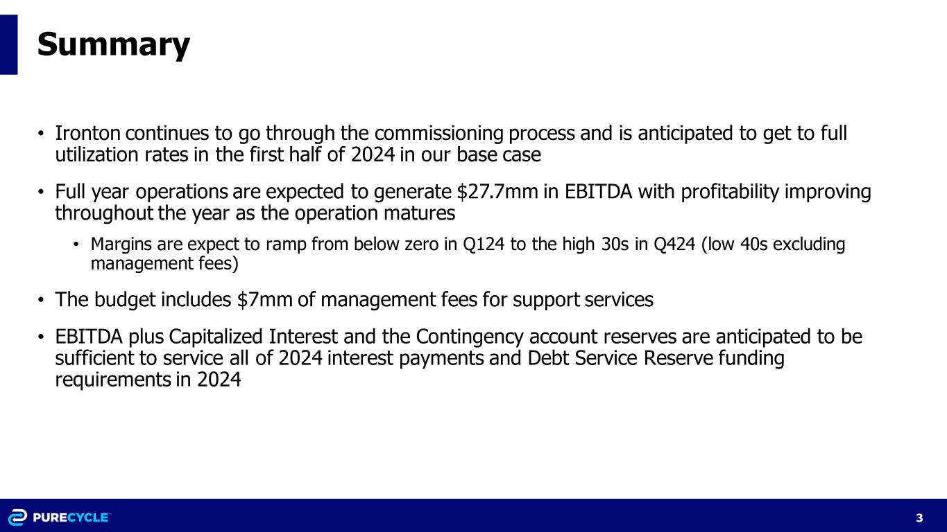3 Summary • Ironton continues to go through the commissioning process and is anticipated to get to full utilization rates in the first half of 2024 in our base case • Full year operations are expected to generate $27.7mm in EBITDA with profitability improving throughout the year as the operation matures • Margins are expect to ramp from below zero in Q124 to the high 30s in Q424 (low 40s excluding management fees) • The budget includes $7mm of management fees for support services • EBITDA plus Capitalized Interest and the Contingency account reserves are anticipated to be sufficient to service all of 2024 interest payments and Debt Service Reserve funding requirements in 2024