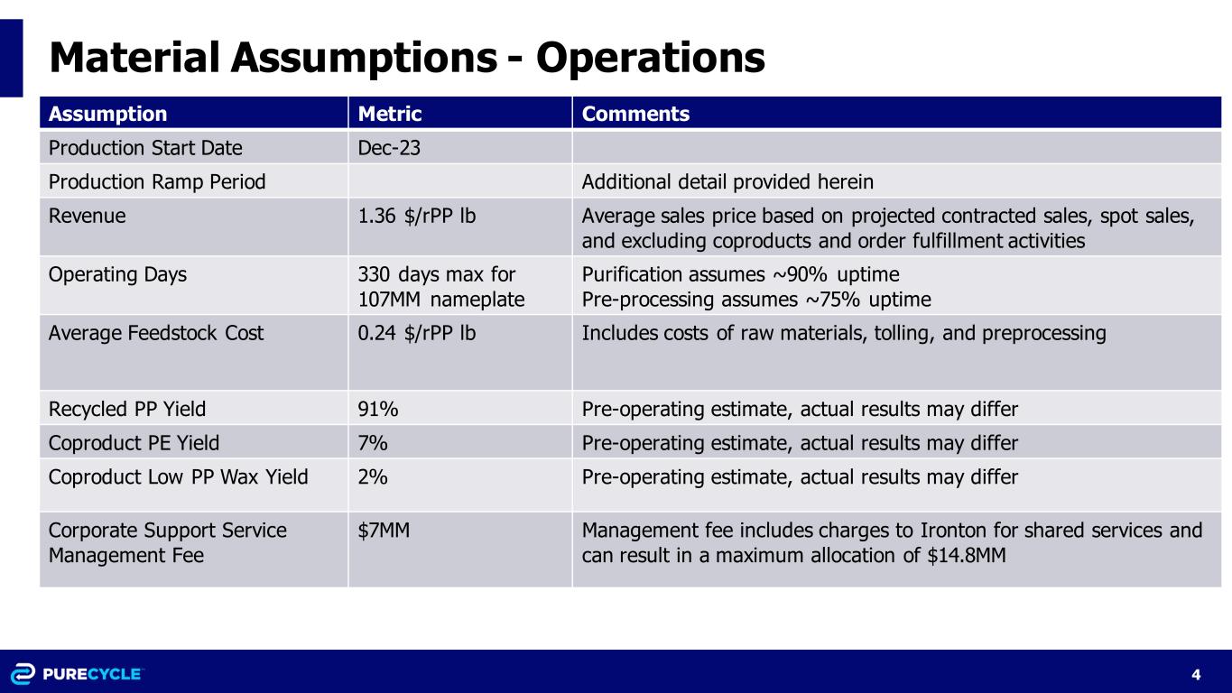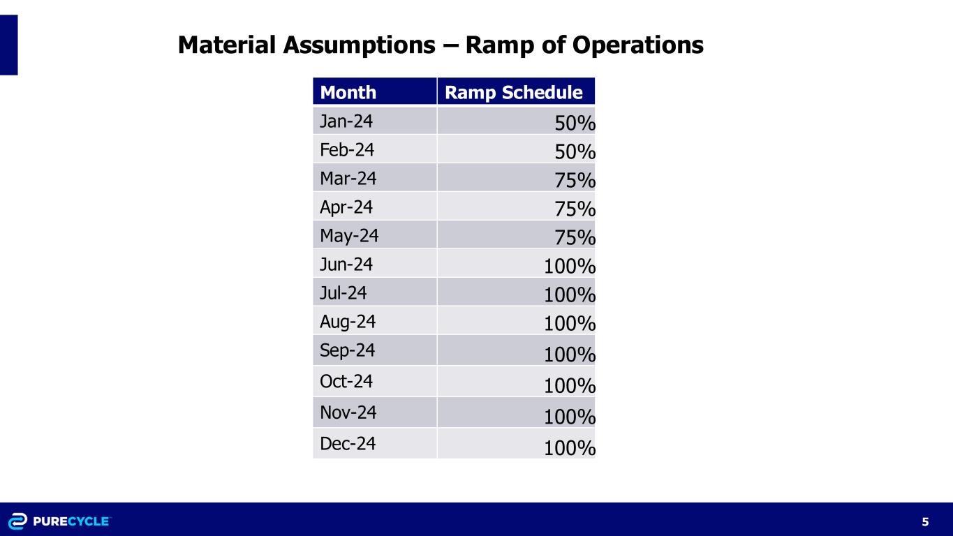 4 Material Assumptions - Operations Assumption Metric Comments Production Start Date Dec-23 Production Ramp Period Additional detail provided herein Revenue 1.36 $/rPP lb Average sales price based on projected contracted sales, spot sales, and excluding coproducts and order fulfillment activities Operating Days 330 days max for 107MM nameplate Purification assumes ~90% uptime Pre-processing assumes ~75% uptime Average Feedstock Cost 0.24 $/rPP lb Includes costs of raw materials, tolling, and preprocessing Recycled PP Yield 91% Pre-operating estimate, actual results may differ Coproduct PE Yield 7% Pre-operating estimate, actual results may differ Coproduct Low PP Wax Yield 2% Pre-operating estimate, actual results may differ Corporate Support Service Management Fee $7MM Management fee includes charges to Ironton for shared services and can result in a maximum allocation of $14.8MM