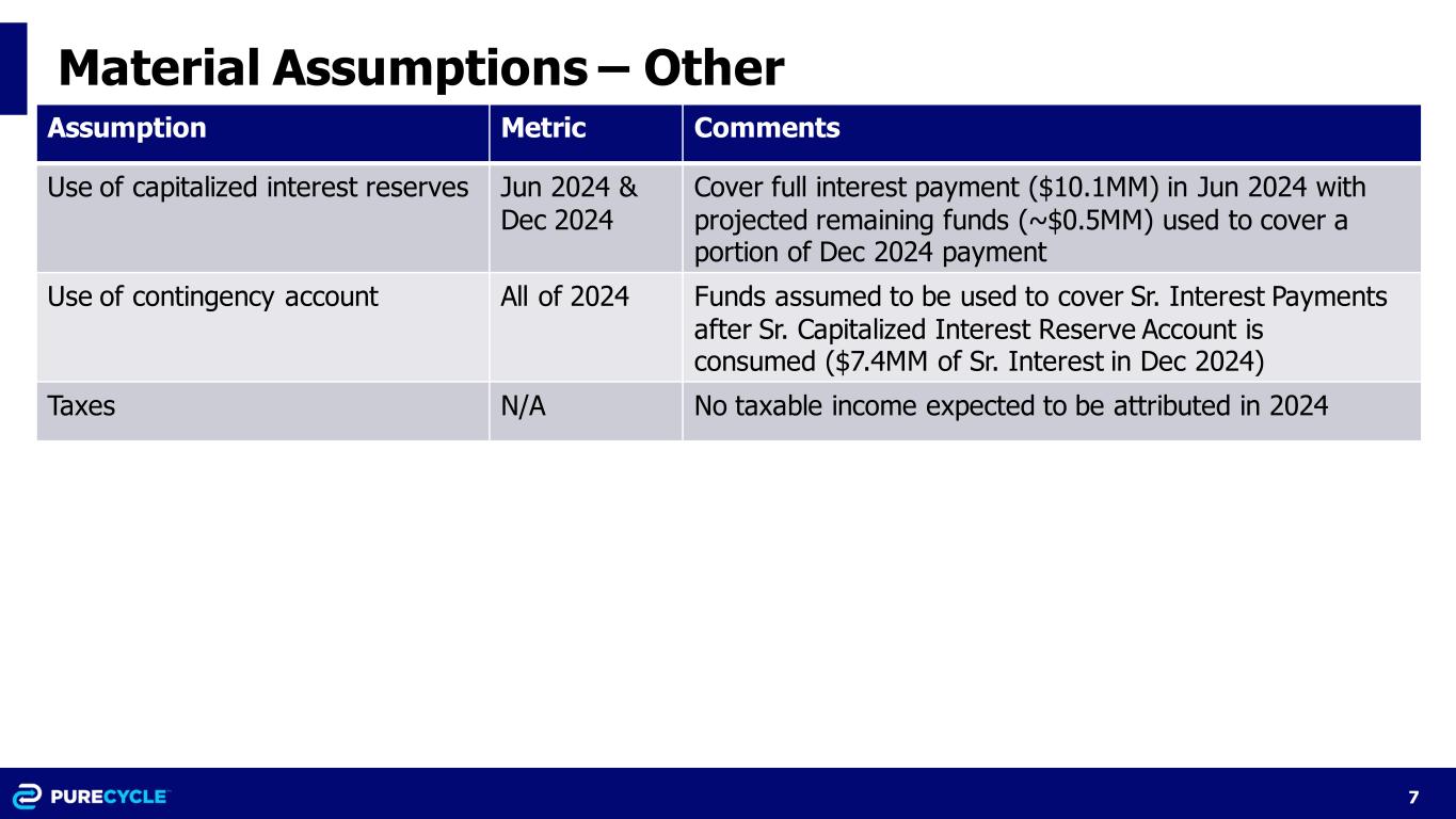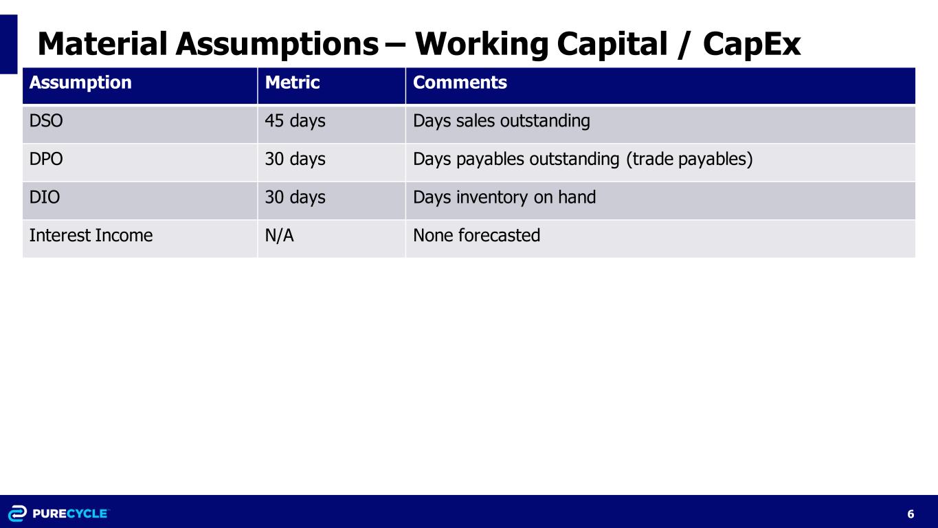 6 Material Assumptions – Working Capital / CapEx Assumption Metric Comments DSO 45 days Days sales outstanding DPO 30 days Days payables outstanding (trade payables) DIO 30 days Days inventory on hand Interest Income N/A None forecasted