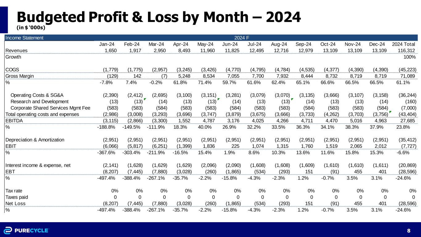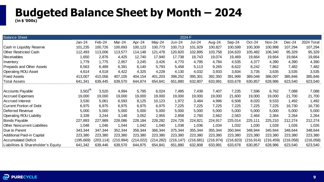 8 Budgeted Profit & Loss by Month – 2024 (in $ ‘000s) Income Statement Jan-24 Feb-24 Mar-24 Apr-24 May-24 Jun-24 Jul-24 Aug-24 Sep-24 Oct-24 Nov-24 Dec-24 2024 Total Revenues 1,650 1,917 2,950 8,493 11,960 11,825 12,495 12,716 12,979 13,109 13,109 13,109 116,312 Growth 100% COGS (1,779) (1,775) (2,957) (3,245) (3,426) (4,770) (4,795) (4,784) (4,535) (4,377) (4,390) (4,390) (45,223) Gross Margin (129) 142 (7) 5,248 8,534 7,055 7,700 7,932 8,444 8,732 8,719 8,719 71,089 % -7.8% 7.4% -0.2% 61.8% 71.4% 59.7% 61.6% 62.4% 65.1% 66.6% 66.5% 66.5% 61.1% Operating Costs & SG&A (2,390) (2,412) (2,695) (3,100) (3,151) (3,281) (3,079) (3,070) (3,135) (3,666) (3,107) (3,158) (36,244) Research and Development (13) (13) (14) (13) (13) (14) (13) (13) (14) (13) (13) (14) (160) Corporate Shared Services Mgmt Fee (583) (583) (584) (583) (583) (584) (583) (583) (584) (583) (583) (584) (7,000) Total operating costs and expenses (2,986) (3,008) (3,293) (3,696) (3,747) (3,879) (3,675) (3,666) (3,733) (4,262) (3,703) (3,756) (43,404) EBITDA (3,115) (2,866) (3,300) 1,552 4,787 3,176 4,025 4,266 4,711 4,470 5,016 4,963 27,685 % -188.8% -149.5% -111.9% 18.3% 40.0% 26.9% 32.2% 33.5% 36.3% 34.1% 38.3% 37.9% 23.8% Depreciation & Amortization (2,951) (2,951) (2,951) (2,951) (2,951) (2,951) (2,951) (2,951) (2,951) (2,951) (2,951) (2,951) (35,412) EBIT (6,066) (5,817) (6,251) (1,399) 1,836 225 1,074 1,315 1,760 1,519 2,065 2,012 (7,727) % -367.6% -303.4% -211.9% -16.5% 15.4% 1.9% 8.6% 10.3% 13.6% 11.6% 15.8% 15.3% -6.6% Interest income & expense, net (2,141) (1,628) (1,629) (1,629) (2,096) (2,090) (1,608) (1,608) (1,609) (1,610) (1,610) (1,611) (20,869) EBT (8,207) (7,445) (7,880) (3,028) (260) (1,865) (534) (293) 151 (91) 455 401 (28,596) % -497.4% -388.4% -267.1% -35.7% -2.2% -15.8% -4.3% -2.3% 1.2% -0.7% 3.5% 3.1% -24.6% Tax rate 0% 0% 0% 0% 0% 0% 0% 0% 0% 0% 0% 0% 0% Taxes paid 0 0 0 0 0 0 0 0 0 0 0 0 0 Net Loss (8,207) (7,445) (7,880) (3,028) (260) (1,865) (534) (293) 151 (91) 455 401 (28,596) % -497.4% -388.4% -267.1% -35.7% -2.2% -15.8% -4.3% -2.3% 1.2% -0.7% 3.5% 3.1% -24.6% 2024 F