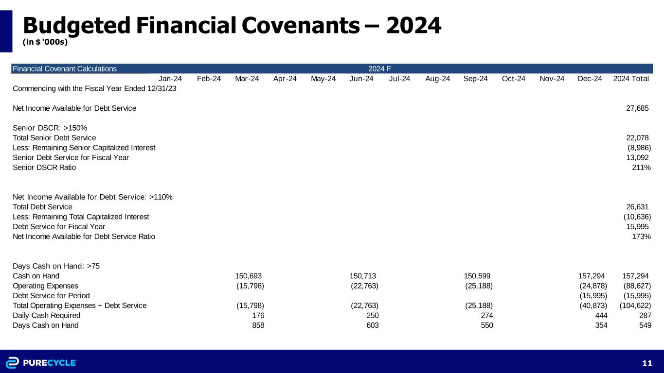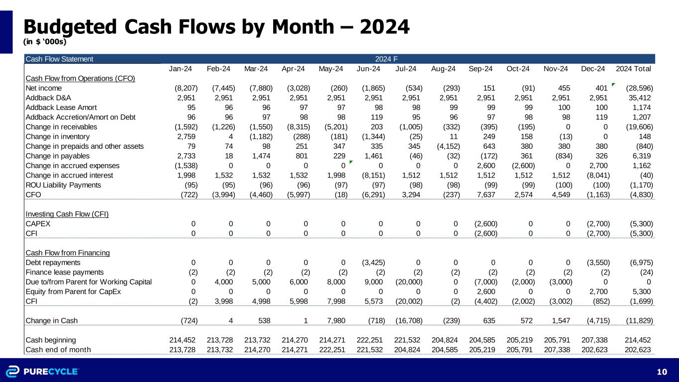 10 Budgeted Cash Flows by Month – 2024 (in $ ‘000s) Cash Flow Statement Jan-24 Feb-24 Mar-24 Apr-24 May-24 Jun-24 Jul-24 Aug-24 Sep-24 Oct-24 Nov-24 Dec-24 2024 Total Cash Flow from Operations (CFO) Net income (8,207) (7,445) (7,880) (3,028) (260) (1,865) (534) (293) 151 (91) 455 401 (28,596) Addback D&A 2,951 2,951 2,951 2,951 2,951 2,951 2,951 2,951 2,951 2,951 2,951 2,951 35,412 Addback Lease Amort 95 96 96 97 97 98 98 99 99 99 100 100 1,174 Addback Accretion/Amort on Debt 96 96 97 98 98 119 95 96 97 98 98 119 1,207 Change in receivables (1,592) (1,226) (1,550) (8,315) (5,201) 203 (1,005) (332) (395) (195) 0 0 (19,606) Change in inventory 2,759 4 (1,182) (288) (181) (1,344) (25) 11 249 158 (13) 0 148 Change in prepaids and other assets 79 74 98 251 347 335 345 (4,152) 643 380 380 380 (840) Change in payables 2,733 18 1,474 801 229 1,461 (46) (32) (172) 361 (834) 326 6,319 Change in accrued expenses (1,538) 0 0 0 0 0 0 0 2,600 (2,600) 0 2,700 1,162 Change in accrued interest 1,998 1,532 1,532 1,532 1,998 (8,151) 1,512 1,512 1,512 1,512 1,512 (8,041) (40) ROU Liability Payments (95) (95) (96) (96) (97) (97) (98) (98) (99) (99) (100) (100) (1,170) CFO (722) (3,994) (4,460) (5,997) (18) (6,291) 3,294 (237) 7,637 2,574 4,549 (1,163) (4,830) Investing Cash Flow (CFI) CAPEX 0 0 0 0 0 0 0 0 (2,600) 0 0 (2,700) (5,300) CFI 0 0 0 0 0 0 0 0 (2,600) 0 0 (2,700) (5,300) Cash Flow from Financing Debt repayments 0 0 0 0 0 (3,425) 0 0 0 0 0 (3,550) (6,975) Finance lease payments (2) (2) (2) (2) (2) (2) (2) (2) (2) (2) (2) (2) (24) Due to/from Parent for Working Capital 0 4,000 5,000 6,000 8,000 9,000 (20,000) 0 (7,000) (2,000) (3,000) 0 0 Equity from Parent for CapEx 0 0 0 0 0 0 0 0 2,600 0 0 2,700 5,300 CFI (2) 3,998 4,998 5,998 7,998 5,573 (20,002) (2) (4,402) (2,002) (3,002) (852) (1,699) Change in Cash (724) 4 538 1 7,980 (718) (16,708) (239) 635 572 1,547 (4,715) (11,829) Cash beginning 214,452 213,728 213,732 214,270 214,271 222,251 221,532 204,824 204,585 205,219 205,791 207,338 214,452 Cash end of month 213,728 213,732 214,270 214,271 222,251 221,532 204,824 204,585 205,219 205,791 207,338 202,623 202,623 2024 F