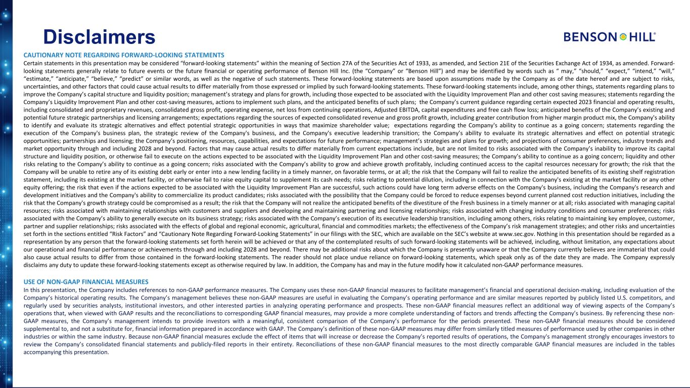 Disclaimers CAUTIONARY NOTE REGARDING FORWARD-LOOKING STATEMENTS Certain statements in this presentation may be considered “forward-looking statements” within the meaning of Section 27A of the Securities Act of 1933, as amended, and Section 21E of the Securities Exchange Act of 1934, as amended. Forward- looking statements generally relate to future events or the future financial or operating performance of Benson Hill Inc. (the “Company” or “Benson Hill”) and may be identified by words such as “ may,” “should,” “expect,” “intend,” “will,” “estimate,” “anticipate,” “believe,” “predict” or similar words, as well as the negative of such statements. These forward-looking statements are based upon assumptions made by the Company as of the date hereof and are subject to risks, uncertainties, and other factors that could cause actual results to differ materially from those expressed or implied by such forward-looking statements. These forward-looking statements include, among other things, statements regarding plans to improve the Company’s capital structure and liquidity position; management’s strategy and plans for growth, including those expected to be associated with the Liquidity Improvement Plan and other cost saving measures; statements regarding the Company’s Liquidity Improvement Plan and other cost-saving measures, actions to implement such plans, and the anticipated benefits of such plans; the Company’s current guidance regarding certain expected 2023 financial and operating results, including consolidated and proprietary revenues, consolidated gross profit, operating expense, net loss from continuing operations, Adjusted EBITDA, capital expenditures and free cash flow loss; anticipated benefits of the Company’s existing and potential future strategic partnerships and licensing arrangements; expectations regarding the sources of expected consolidated revenue and gross profit growth, including greater contribution from higher margin product mix, the Company's ability to identify and evaluate its strategic alternatives and effect potential strategic opportunities in ways that maximize shareholder value; expectations regarding the Company's ability to continue as a going concern; statements regarding the execution of the Company's business plan, the strategic review of the Company's business, and the Company's executive leadership transition; the Company’s ability to evaluate its strategic alternatives and effect on potential strategic opportunities; partnerships and licensing; the Company’s positioning, resources, capabilities, and expectations for future performance; management’s strategies and plans for growth; and projections of consumer preferences, industry trends and market opportunity through and including 2028 and beyond. Factors that may cause actual results to differ materially from current expectations include, but are not limited to risks associated with the Company’s inability to improve its capital structure and liquidity position, or otherwise fail to execute on the actions expected to be associated with the Liquidity Improvement Plan and other cost-saving measures; the Company’s ability to continue as a going concern; liquidity and other risks relating to the Company’s ability to continue as a going concern; risks associated with the Company’s ability to grow and achieve growth profitably, including continued access to the capital resources necessary for growth; the risk that the Company will be unable to retire any of its existing debt early or enter into a new lending facility in a timely manner, on favorable terms, or at all; the risk that the Company will fail to realize the anticipated benefits of its existing shelf registration statement, including its existing at the market facility, or otherwise fail to raise equity capital to supplement its cash needs; risks relating to potential dilution, including in connection with the Company's existing at the market facility or any other equity offering; the risk that even if the actions expected to be associated with the Liquidity Improvement Plan are successful, such actions could have long term adverse effects on the Company's business, including the Company's research and development initiatives and the Company's ability to commercialize its product candidates; risks associated with the possibility that the Company could be forced to reduce expenses beyond current planned cost reduction initiatives, including the risk that the Company's growth strategy could be compromised as a result; the risk that the Company will not realize the anticipated benefits of the divestiture of the Fresh business in a timely manner or at all; risks associated with managing capital resources; risks associated with maintaining relationships with customers and suppliers and developing and maintaining partnering and licensing relationships; risks associated with changing industry conditions and consumer preferences; risks associated with the Company’s ability to generally execute on its business strategy; risks associated with the Company’s execution of its executive leadership transition, including among others, risks relating to maintaining key employee, customer, partner and supplier relationships; risks associated with the effects of global and regional economic, agricultural, financial and commodities markets; the effectiveness of the Company’s risk management strategies; and other risks and uncertainties set forth in the sections entitled “Risk Factors” and “Cautionary Note Regarding Forward-Looking Statements” in our filings with the SEC, which are available on the SEC’s website at www.sec.gov. Nothing in this presentation should be regarded as a representation by any person that the forward-looking statements set forth herein will be achieved or that any of the contemplated results of such forward-looking statements will be achieved, including, wit