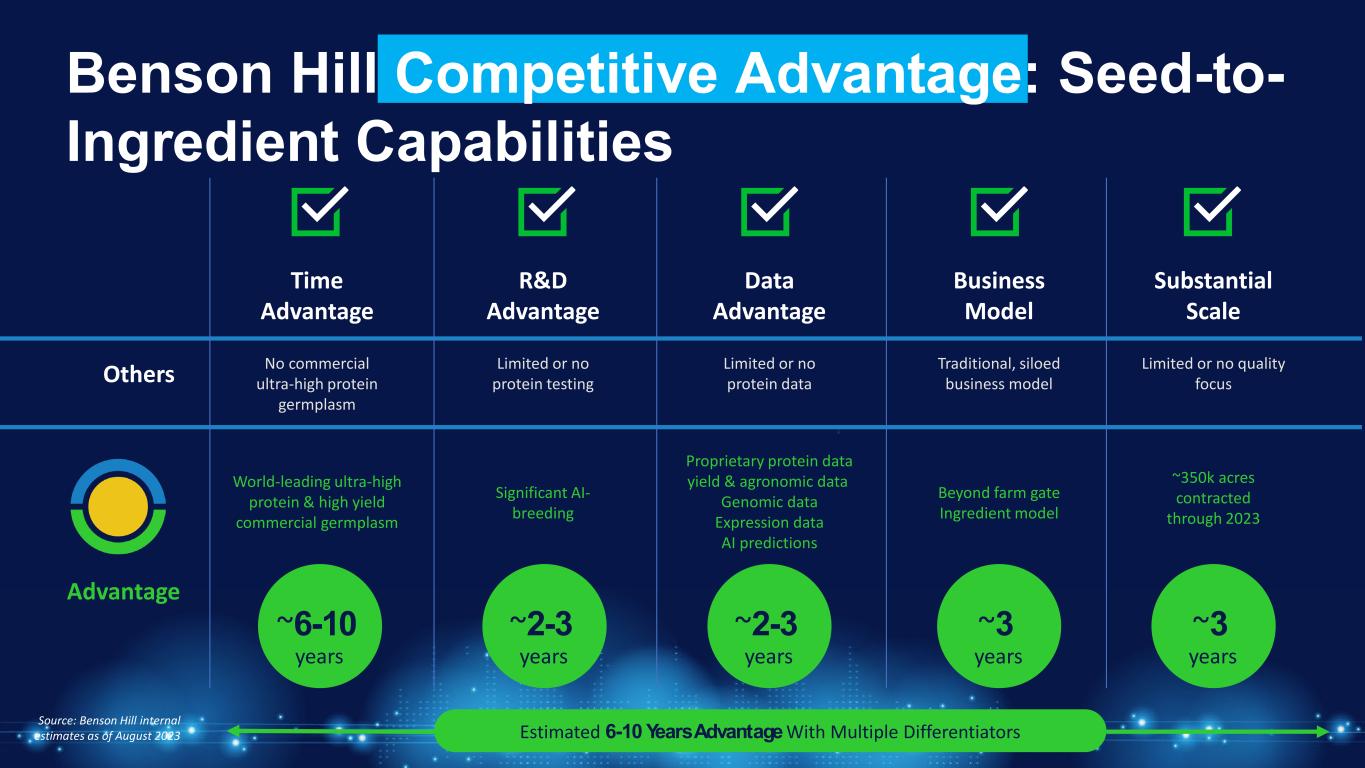 Others Advantage Source: Benson Hill internal estimates as of August 2023 Time Advantage World-leading ultra-high protein & high yield commercial germplasm No commercial ultra-high protein germplasm ~6-10 years R&D Advantage Limited or no protein testing Significant AI- breeding ~2-3 years Data Advantage Limited or no protein data Proprietary protein data yield & agronomic data Genomic data Expression data AI predictions ~2-3 years Business Model Traditional, siloed business model Beyond farm gate Ingredient model ~3 years Substantial Scale Limited or no quality focus ~350k acres contracted through 2023 ~3 years Estimated 6-10 YearsAdvantage With Multiple Differentiators Benson Hill Competitive Advantage: Seed-to- Ingredient Capabilities