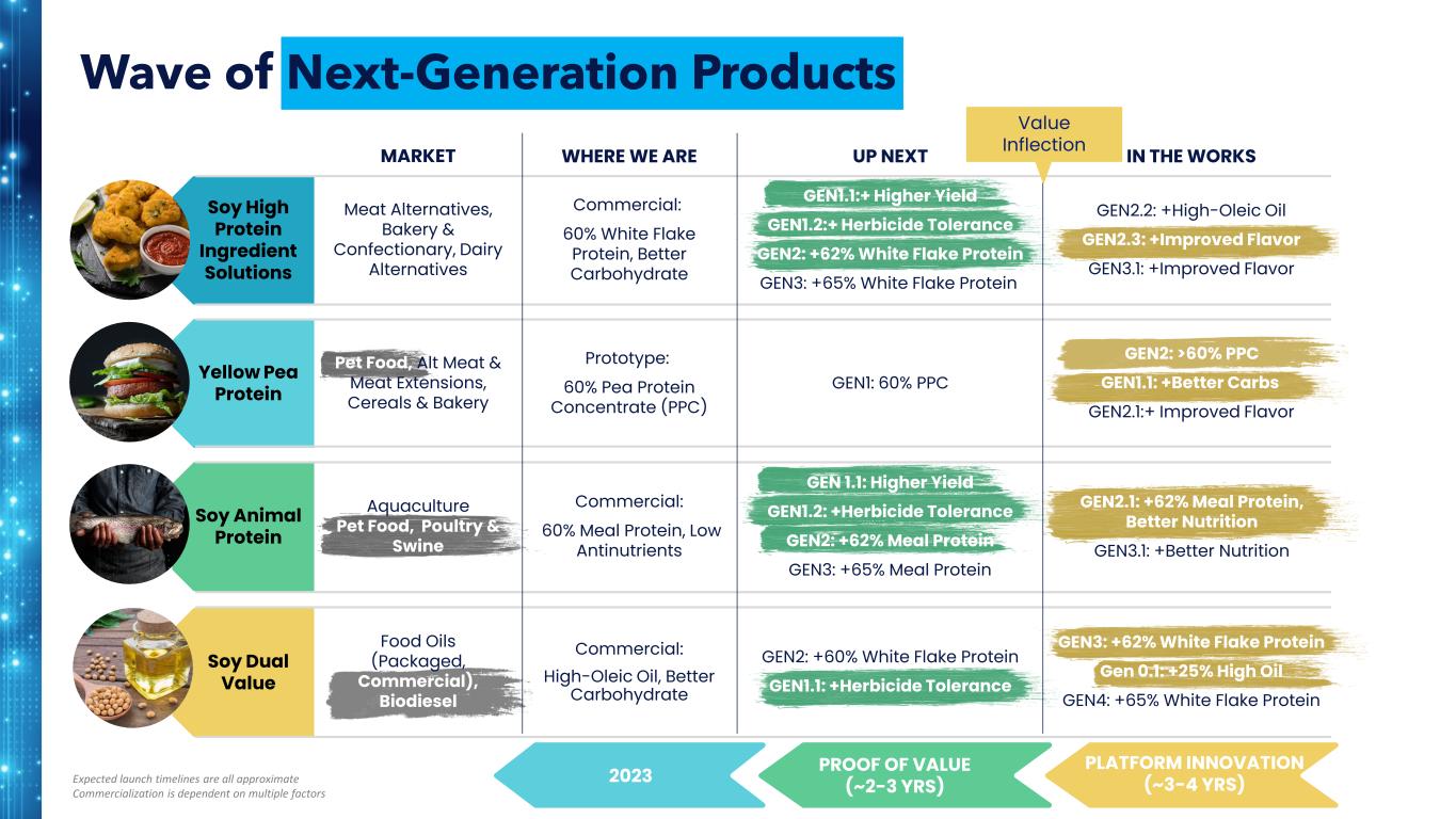 Wave of Next-Generation Products IN THE WORKS GEN2: >60% PPC GEN1.1: +Better Carbs GEN2.1:+ Improved Flavor UP NEXT GEN1: 60% PPC GEN2: +60% White Flake Protein GEN1.1: +Herbicide Tolerance WHERE WE ARE Commercial: 60% White Flake Protein, Better Carbohydrate Commercial: 60% Meal Protein, Low Antinutrients Commercial: High-Oleic Oil, Better Carbohydrate Prototype: 60% Pea Protein Concentrate (PPC) Soy High Protein Ingredient Solutions Yellow Pea Protein Soy Animal Protein Soy Dual Value MARKET Meat Alternatives, Bakery & Confectionary, Dairy Alternatives Value Inflection GEN2.1: +62% Meal Protein, Better Nutrition GEN3.1: +Better Nutrition GEN2.2: +High-Oleic Oil GEN2.3: +Improved Flavor GEN3.1: +Improved Flavor Pet Food, Alt Meat & Meat Extensions, Cereals & Bakery Aquaculture Pet Food, Poultry & Swine Food Oils (Packaged, Commercial), Biodiesel GEN1.1:+ Higher Yield GEN1.2:+ Herbicide Tolerance GEN2: +62% White Flake Protein GEN3: +65% White Flake Protein PLATFORM INNOVATION (~3-4 YRS) PROOF OF VALUE (~2-3 YRS)2023 GEN3: +62% White Flake Protein Gen 0.1: +25% High Oil GEN4: +65% White Flake Protein GEN 1.1: Higher Yield GEN1.2: +Herbicide Tolerance GEN2: +62% Meal Protein GEN3: +65% Meal Protein Expected launch timelines are all approximate Commercialization is dependent on multiple factors
