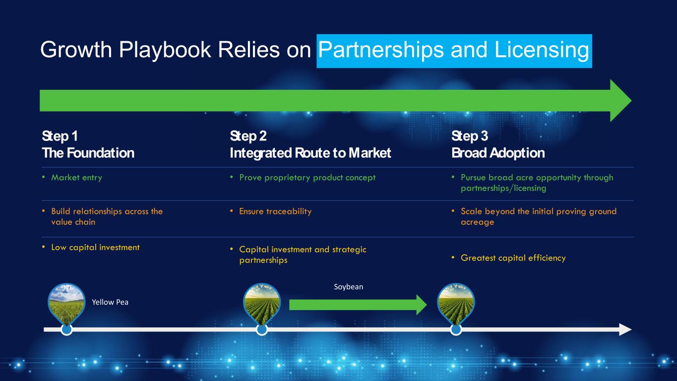 • Market entry • Build relationships across the value chain • Low capital investment Step 1 The Foundation • Prove proprietary product concept • Ensure traceability • Capital investment and strategic partnerships Step 2 Integrated Route to Market • Pursue broad acre opportunity through partnerships/licensing • Scale beyond the initial proving ground acreage • Greatest capital efficiency Step 3 Broad Adoption Yellow Pea Soybean Growth Playbook Relies on Partnerships and Licensing