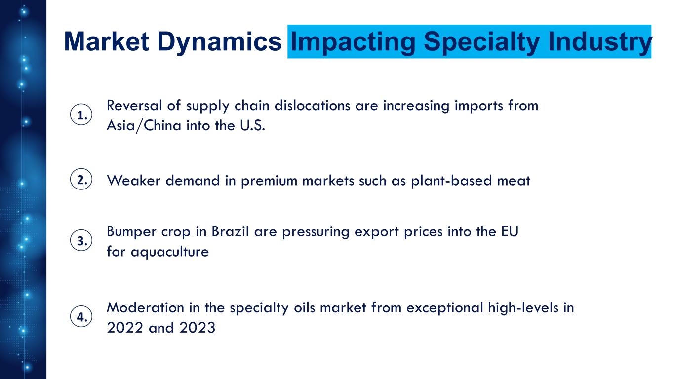 Moderation in the specialty oils market from exceptional high-levels in 2022 and 2023 Market Dynamics Impacting Specialty Industry Bumper crop in Brazil are pressuring export prices into the EU for aquaculture Weaker demand in premium markets such as plant-based meat Reversal of supply chain dislocations are increasing imports from Asia/China into the U.S. 1. 2. 3. 4.