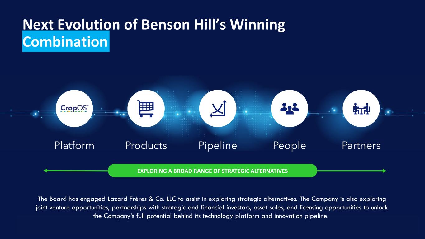 Platform Products Pipeline People Partners Next Evolution of Benson Hill’s Winning Combination EXPLORING A BROAD RANGE OF STRATEGIC ALTERNATIVES The Board has engaged Lazard Frères & Co. LLC to assist in exploring strategic alternatives. The Company is also exploring joint venture opportunities, partnerships with strategic and financial investors, asset sales, and licensing opportunities to unlock the Company’s full potential behind its technology platform and innovation pipeline.