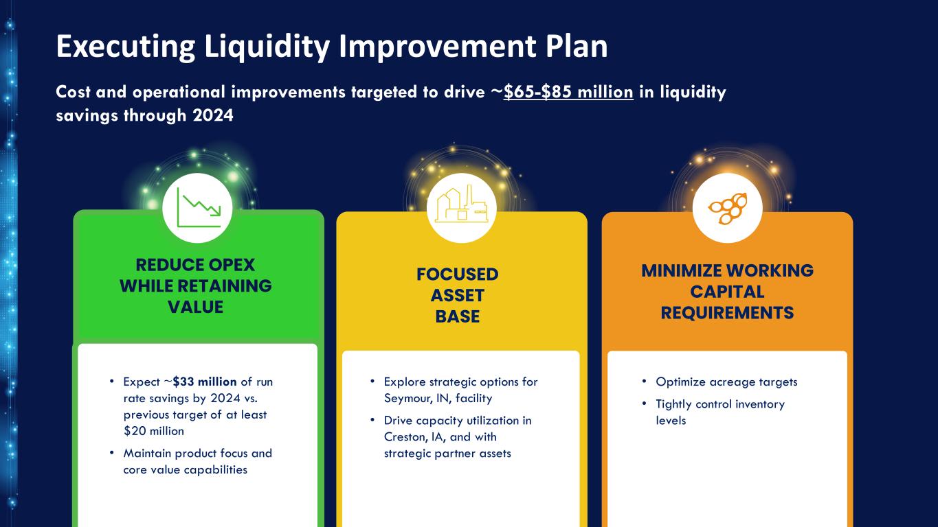 MINIMIZE WORKING CAPITAL REQUIREMENTS REDUCE OPEX WHILE RETAINING VALUE FOCUSED ASSET BASE Executing Liquidity Improvement Plan • Explore strategic options for Seymour, IN, facility • Drive capacity utilization in Creston, IA, and with strategic partner assets • Expect ~$33 million of run rate savings by 2024 vs. previous target of at least $20 million • Maintain product focus and core value capabilities • Optimize acreage targets • Tightly control inventory levels Cost and operational improvements targeted to drive ~$65-$85 million in liquidity savings through 2024