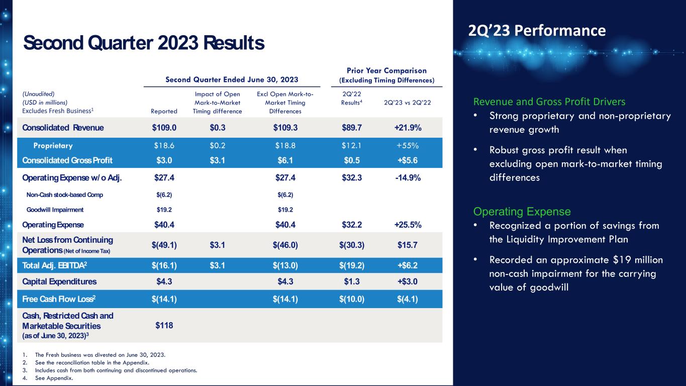 Second Quarter 2023 Results Second Quarter Ended June 30, 2023 Prior Year Comparison (Excluding Timing Differences) (Unaudited) (USD in millions) Excludes Fresh Business1 Reported Impact of Open Mark-to-Market Timing difference Excl Open Mark-to- Market Timing Differences 2Q’22 Results4 2Q’23 vs 2Q’22 Consolidated Revenue $109.0 $0.3 $109.3 $89.7 +21.9% Proprietary $18.6 $0.2 $18.8 $12.1 +55% Consolidated Gross Profit $3.0 $3.1 $6.1 $0.5 +$5.6 Operating Expense w/o Adj. $27.4 $27.4 $32.3 -14.9% Non-Cash stock-based Comp $(6.2) $(6.2) Goodwill Impairment $19.2 $19.2 Operating Expense $40.4 $40.4 $32.2 +25.5% Net Loss from Continuing Operations (Net of Income Tax) $(49.1) $3.1 $(46.0) $(30.3) $15.7 Total Adj. EBITDA2 $(16.1) $3.1 $(13.0) $(19.2) +$6.2 Capital Expenditures $4.3 $4.3 $1.3 +$3.0 Free Cash Flow Loss2 $(14.1) $(14.1) $(10.0) $(4.1) Cash, Restricted Cash and Marketable Securities (as of June 30, 2023)3 $118 1. The Fresh business was divested on June 30, 2023. 2. See the reconciliation table in the Appendix. 3. Includes cash from both continuing and discontinued operations. 4. See Appendix. Revenue and Gross Profit Drivers • Strong proprietary and non-proprietary revenue growth • Robust gross profit result when excluding open mark-to-market timing differences Operating Expense • Recognized a portion of savings from the Liquidity Improvement Plan • Recorded an approximate $19 million non-cash impairment for the carrying value of goodwill 2Q’23 Performance