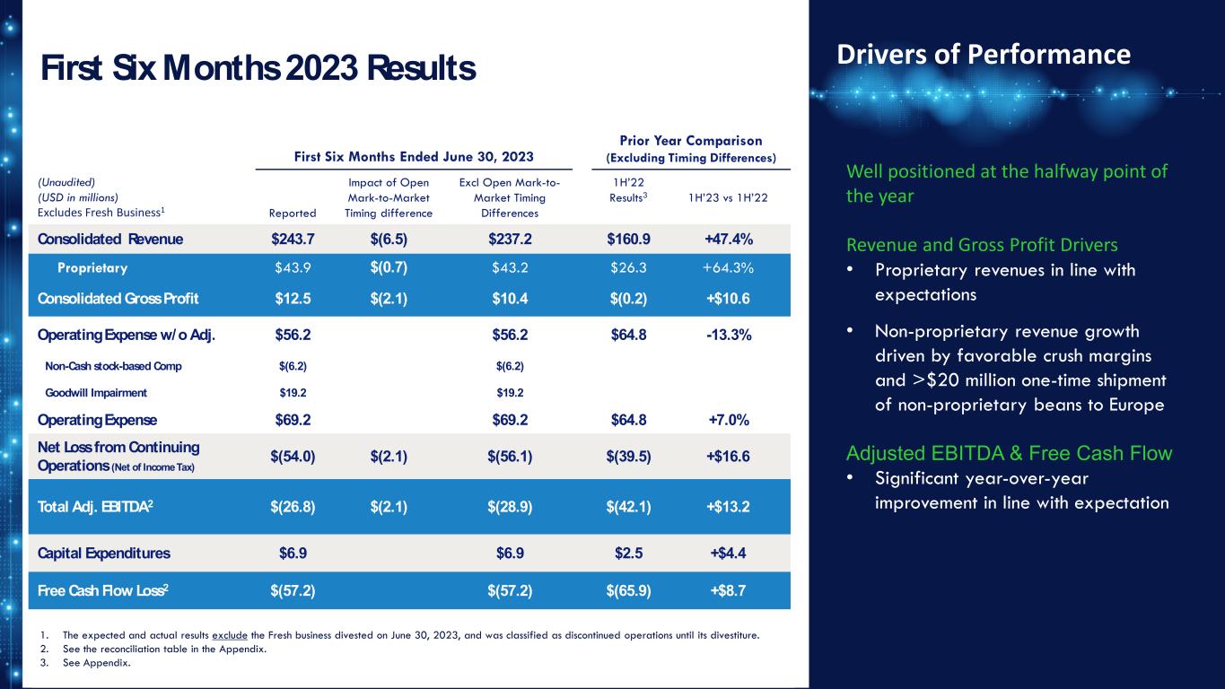 First Six Months 2023 Results First Six Months Ended June 30, 2023 Prior Year Comparison (Excluding Timing Differences) (Unaudited) (USD in millions) Excludes Fresh Business1 Reported Impact of Open Mark-to-Market Timing difference Excl Open Mark-to- Market Timing Differences 1H’22 Results3 1H’23 vs 1H’22 Consolidated Revenue $243.7 $(6.5) $237.2 $160.9 +47.4% Proprietary $43.9 $(0.7) $43.2 $26.3 +64.3% Consolidated Gross Profit $12.5 $(2.1) $10.4 $(0.2) +$10.6 Operating Expense w/o Adj. $56.2 $56.2 $64.8 -13.3% Non-Cash stock-based Comp $(6.2) $(6.2) Goodwill Impairment $19.2 $19.2 Operating Expense $69.2 $69.2 $64.8 +7.0% Net Loss from Continuing Operations (Net of Income Tax) $(54.0) $(2.1) $(56.1) $(39.5) +$16.6 Total Adj. EBITDA2 $(26.8) $(2.1) $(28.9) $(42.1) +$13.2 Capital Expenditures $6.9 $6.9 $2.5 +$4.4 Free Cash Flow Loss2 $(57.2) $(57.2) $(65.9) +$8.7 Well positioned at the halfway point of the year Revenue and Gross Profit Drivers • Proprietary revenues in line with expectations • Non-proprietary revenue growth driven by favorable crush margins and >$20 million one-time shipment of non-proprietary beans to Europe Adjusted EBITDA & Free Cash Flow • Significant year-over-year improvement in line with expectation Drivers of Performance 1. The expected and actual results exclude the Fresh business divested on June 30, 2023, and was classified as discontinued operations until its divestiture. 2. See the reconciliation table in the Appendix. 3. See Appendix.