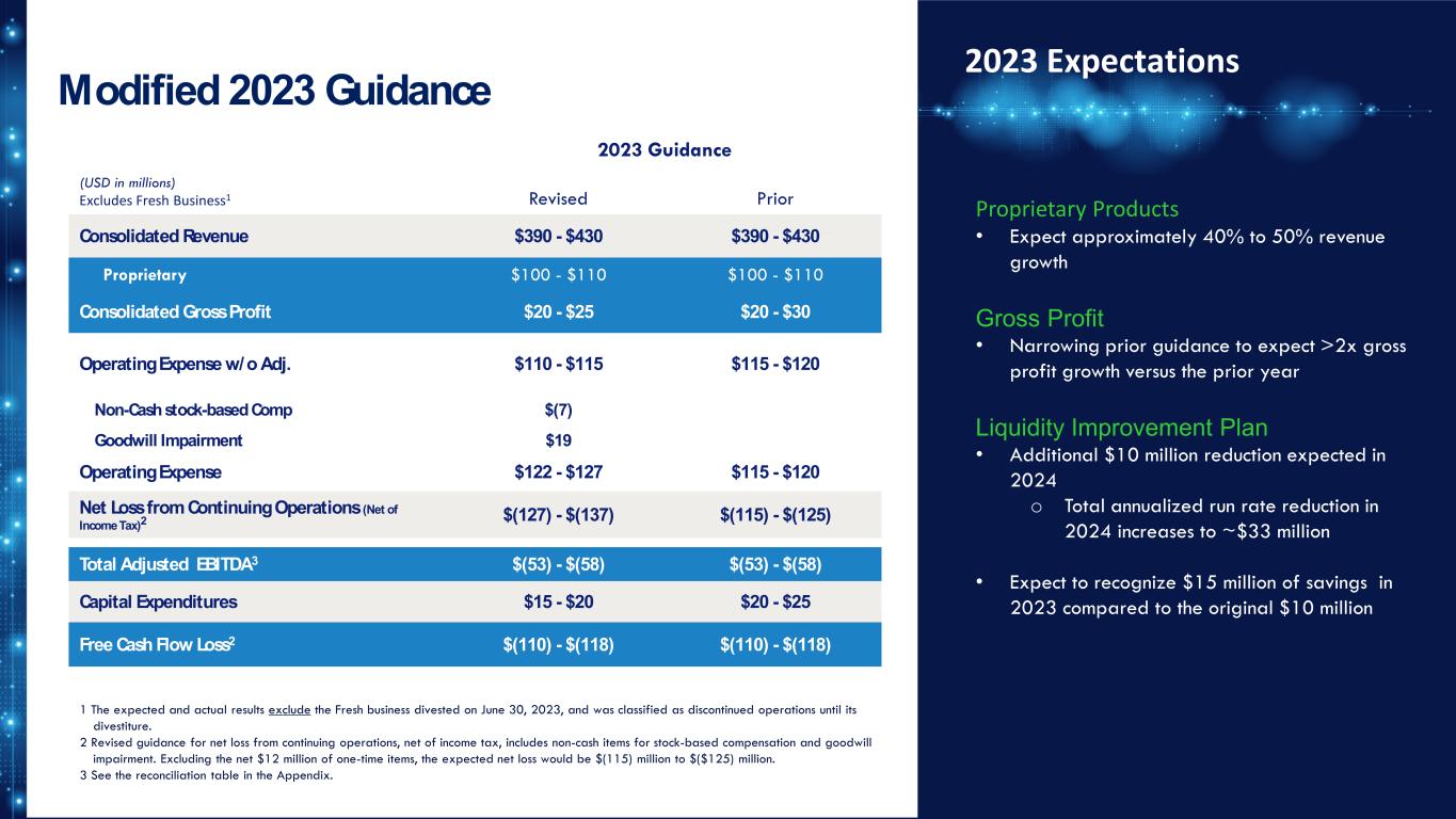 Modified 2023 Guidance 2023 Guidance (USD in millions) Excludes Fresh Business1 Revised Prior Consolidated Revenue $390 - $430 $390 - $430 Proprietary $100 - $110 $100 - $110 Consolidated Gross Profit $20 - $25 $20 - $30 Operating Expense w/o Adj. $110 - $115 $115 - $120 Non-Cash stock-based Comp $(7) Goodwill Impairment $19 Operating Expense $122 - $127 $115 - $120 Net Loss from Continuing Operations (Net of Income Tax)2 $(127) - $(137) $(115) - $(125) Total Adjusted EBITDA3 $(53) - $(58) $(53) - $(58) Capital Expenditures $15 - $20 $20 - $25 Free Cash Flow Loss2 $(110) - $(118) $(110) - $(118) 1 The expected and actual results exclude the Fresh business divested on June 30, 2023, and was classified as discontinued operations until its divestiture. 2 Revised guidance for net loss from continuing operations, net of income tax, includes non-cash items for stock-based compensation and goodwill impairment. Excluding the net $12 million of one-time items, the expected net loss would be $(115) million to $($125) million. 3 See the reconciliation table in the Appendix. 2023 Expectations Proprietary Products • Expect approximately 40% to 50% revenue growth Gross Profit • Narrowing prior guidance to expect >2x gross profit growth versus the prior year Liquidity Improvement Plan • Additional $10 million reduction expected in 2024 o Total annualized run rate reduction in 2024 increases to ~$33 million • Expect to recognize $15 million of savings in 2023 compared to the original $10 million