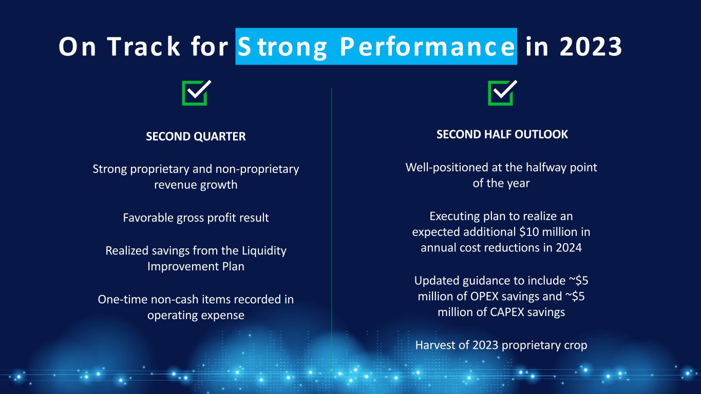On Trac k for S trong P erformanc e in 2023 SECOND QUARTER Strong proprietary and non-proprietary revenue growth Favorable gross profit result Realized savings from the Liquidity Improvement Plan One-time non-cash items recorded in operating expense SECOND HALF OUTLOOK Well-positioned at the halfway point of the year Executing plan to realize an expected additional $10 million in annual cost reductions in 2024 Updated guidance to include ~$5 million of OPEX savings and ~$5 million of CAPEX savings Harvest of 2023 proprietary crop