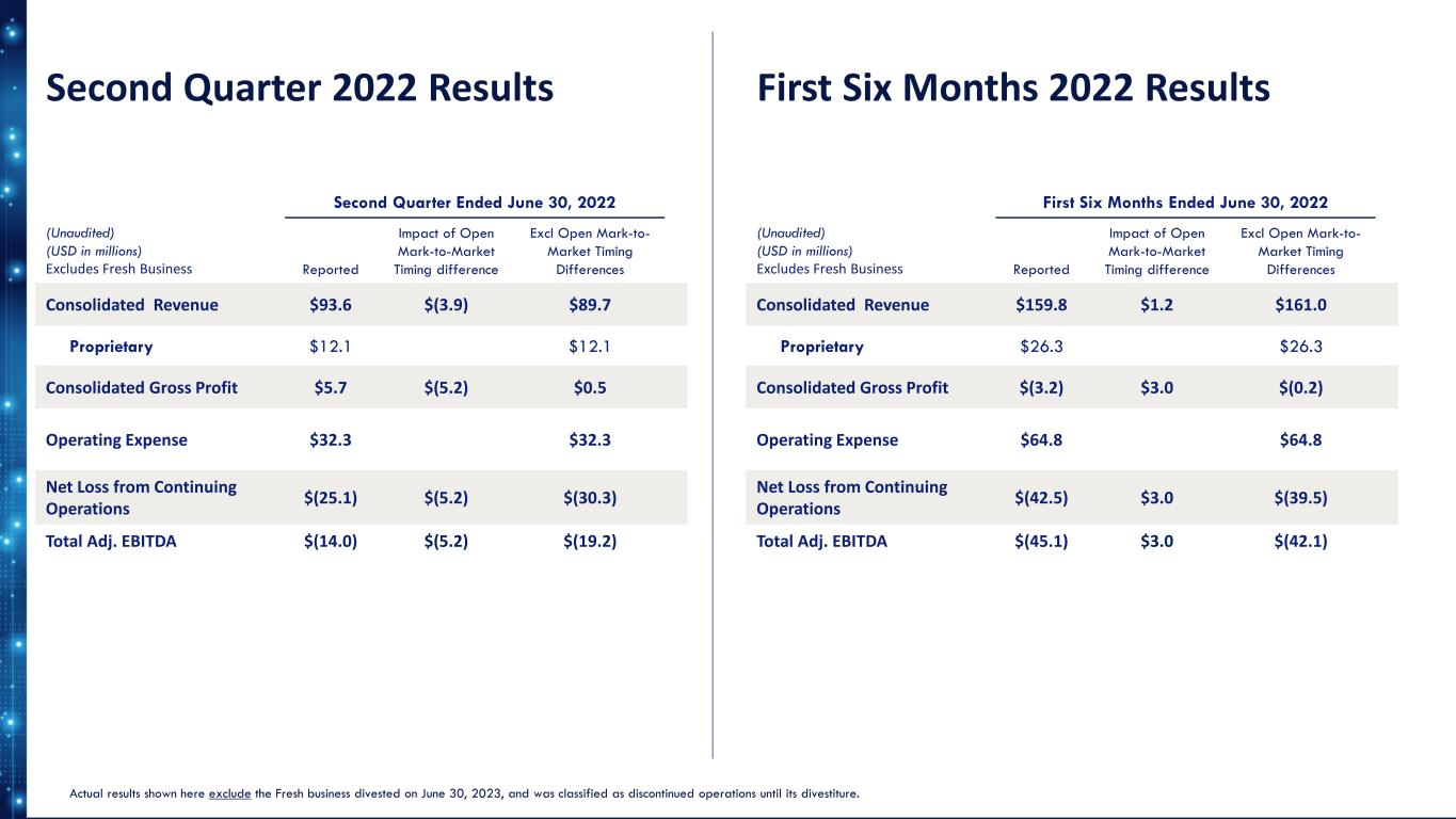 Second Quarter 2022 Results Second Quarter Ended June 30, 2022 (Unaudited) (USD in millions) Excludes Fresh Business Reported Impact of Open Mark-to-Market Timing difference Excl Open Mark-to- Market Timing Differences Consolidated Revenue $93.6 $(3.9) $89.7 Proprietary $12.1 $12.1 Consolidated Gross Profit $5.7 $(5.2) $0.5 Operating Expense $32.3 $32.3 Net Loss from Continuing Operations $(25.1) $(5.2) $(30.3) Total Adj. EBITDA $(14.0) $(5.2) $(19.2) First Six Months 2022 Results First Six Months Ended June 30, 2022 (Unaudited) (USD in millions) Excludes Fresh Business Reported Impact of Open Mark-to-Market Timing difference Excl Open Mark-to- Market Timing Differences Consolidated Revenue $159.8 $1.2 $161.0 Proprietary $26.3 $26.3 Consolidated Gross Profit $(3.2) $3.0 $(0.2) Operating Expense $64.8 $64.8 Net Loss from Continuing Operations $(42.5) $3.0 $(39.5) Total Adj. EBITDA $(45.1) $3.0 $(42.1) Actual results shown here exclude the Fresh business divested on June 30, 2023, and was classified as discontinued operations until its divestiture.