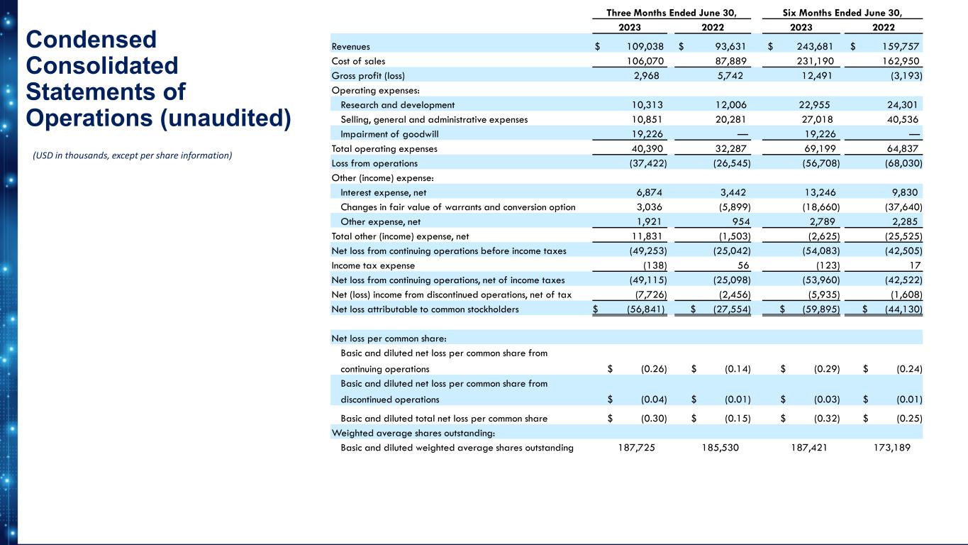 Condensed Consolidated Statements of Operations (unaudited) (USD in thousands, except per share information) Three Months Ended June 30, Six Months Ended June 30, 2023 2022 2023 2022 Revenues $ 109,038 $ 93,631 $ 243,681 $ 159,757 Cost of sales 106,070 87,889 231,190 162,950 Gross profit (loss) 2,968 5,742 12,491 (3,193) Operating expenses: Research and development 10,313 12,006 22,955 24,301 Selling, general and administrative expenses 10,851 20,281 27,018 40,536 Impairment of goodwill 19,226 — 19,226 — Total operating expenses 40,390 32,287 69,199 64,837 Loss from operations (37,422) (26,545) (56,708) (68,030) Other (income) expense: Interest expense, net 6,874 3,442 13,246 9,830 Changes in fair value of warrants and conversion option 3,036 (5,899) (18,660) (37,640) Other expense, net 1,921 954 2,789 2,285 Total other (income) expense, net 11,831 (1,503) (2,625) (25,525) Net loss from continuing operations before income taxes (49,253) (25,042) (54,083) (42,505) Income tax expense (138) 56 (123) 17 Net loss from continuing operations, net of income taxes (49,115) (25,098) (53,960) (42,522) Net (loss) income from discontinued operations, net of tax (7,726) (2,456) (5,935) (1,608) Net loss attributable to common stockholders $ (56,841) $ (27,554) $ (59,895) $ (44,130) Net loss per common share: Basic and diluted net loss per common share from continuing operations $ (0.26) $ (0.14) $ (0.29) $ (0.24) Basic and diluted net loss per common share from discontinued operations $ (0.04) $ (0.01) $ (0.03) $ (0.01) Basic and diluted total net loss per common share $ (0.30) $ (0.15) $ (0.32) $ (0.25) Weighted average shares outstanding: Basic and diluted weighted average shares outstanding 187,725 185,530 187,421 173,189