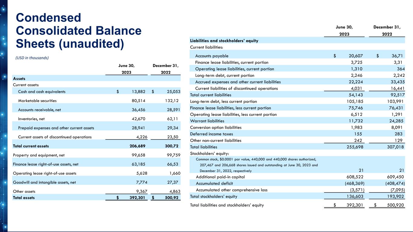 Condensed Consolidated Balance Sheets (unaudited) (USD in thousands) June 30, 2023 December 31, 2022 Assets Current assets: Cash and cash equivalents $ 13,882 $ 25,053 Marketable securities 80,514 132,12 Accounts receivable, net 36,456 28,591 Inventories, net 42,670 62,11 Prepaid expenses and other current assets 28,941 29,34 Current assets of discontinued operations 4,226 23,50 Total current assets 206,689 300,72 Property and equipment, net 99,658 99,759 Finance lease right-of-use assets, net 63,185 66,53 Operating lease right-of-use assets 5,628 1,660 Goodwill and intangible assets, net 7,774 27,37 Other assets 9,367 4,863 Total assets $ 392,301 $ 500,92 June 30, 2023 December 31, 2022 Liabilities and stockholders’ equity Current liabilities: Accounts payable $ 20,607 $ 36,71 Finance lease liabilities, current portion 3,725 3,31 Operating lease liabilities, current portion 1,310 364 Long-term debt, current portion 2,246 2,242 Accrued expenses and other current liabilities 22,224 33,435 Current liabilities of discontinued operations 4,031 16,441 Total current liabilities 54,143 92,517 Long-term debt, less current portion 105,185 103,991 Finance lease liabilities, less current portion 75,746 76,431 Operating lease liabilities, less current portion 6,512 1,291 Warrant liabilities 11,732 24,285 Conversion option liabilities 1,983 8,091 Deferred income taxes 155 283 Other non-current liabilities 242 129 Total liabilities 255,698 307,018 Stockholders’ equity: Common stock, $0.0001 par value, 440,000 and 440,000 shares authorized, 207,467 and 206,668 shares issued and outstanding at June 30, 2023 and December 31, 2022, respectively 21 21 Additional paid-in capital 608,522 609,450 Accumulated deficit (468,369) (408,474) Accumulated other comprehensive loss (3,571) (7,095) Total stockholders’ equity 136,603 193,902 Total liabilities and stockholders’ equity $ 392,301 $ 500,920
