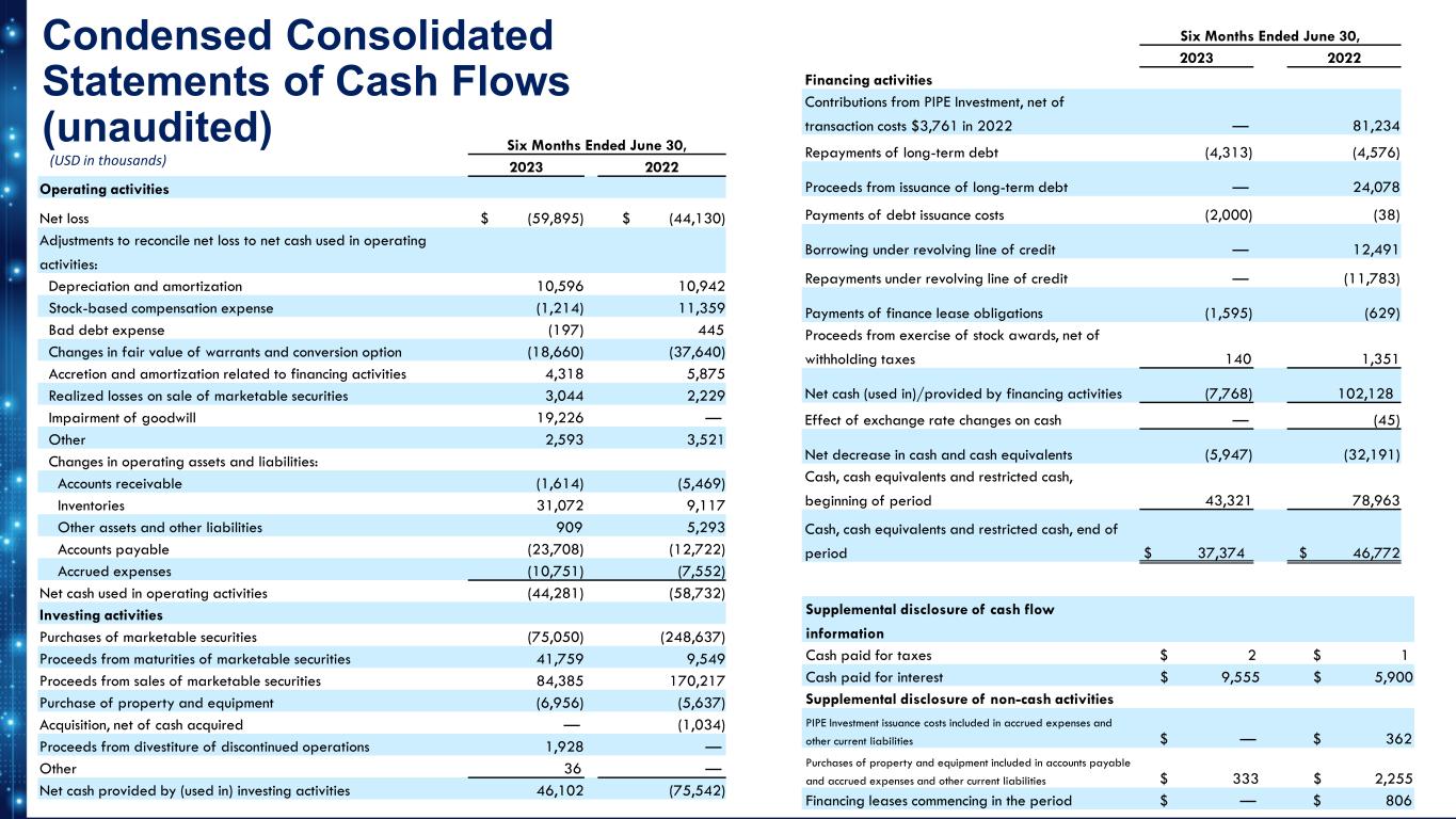 Condensed Consolidated Statements of Cash Flows (unaudited) (USD in thousands) Six Months Ended June 30, 2023 2022 Operating activities Net loss $ (59,895) $ (44,130) Adjustments to reconcile net loss to net cash used in operating activities: Depreciation and amortization 10,596 10,942 Stock-based compensation expense (1,214) 11,359 Bad debt expense (197) 445 Changes in fair value of warrants and conversion option (18,660) (37,640) Accretion and amortization related to financing activities 4,318 5,875 Realized losses on sale of marketable securities 3,044 2,229 Impairment of goodwill 19,226 — Other 2,593 3,521 Changes in operating assets and liabilities: Accounts receivable (1,614) (5,469) Inventories 31,072 9,117 Other assets and other liabilities 909 5,293 Accounts payable (23,708) (12,722) Accrued expenses (10,751) (7,552) Net cash used in operating activities (44,281) (58,732) Investing activities Purchases of marketable securities (75,050) (248,637) Proceeds from maturities of marketable securities 41,759 9,549 Proceeds from sales of marketable securities 84,385 170,217 Purchase of property and equipment (6,956) (5,637) Acquisition, net of cash acquired — (1,034) Proceeds from divestiture of discontinued operations 1,928 — Other 36 — Net cash provided by (used in) investing activities 46,102 (75,542) Six Months Ended June 30, 2023 2022 Financing activities Contributions from PIPE Investment, net of transaction costs $3,761 in 2022 — 81,234 Repayments of long-term debt (4,313) (4,576) Proceeds from issuance of long-term debt — 24,078 Payments of debt issuance costs (2,000) (38) Borrowing under revolving line of credit — 12,491 Repayments under revolving line of credit — (11,783) Payments of finance lease obligations (1,595) (629) Proceeds from exercise of stock awards, net of withholding taxes 140 1,351 Net cash (used in)/provided by financing activities (7,768) 102,128 Effect of exchange rate changes on cash — (45) Net decrease in cash and cash equivalents (5,947) (32,191) Cash, cash equivalents and restricted cash, beginning of period 43,321 78,963 Cash, cash equivalents and restricted cash, end of period $ 37,374 $ 46,772 Supplemental disclosure of cash flow information Cash paid for taxes $ 2 $ 1 Cash paid for interest $ 9,555 $ 5,900 Supplemental disclosure of non-cash activities PIPE Investment issuance costs included in accrued expenses and other current liabilities $ — $ 362 Purchases of property and equipment included in accounts payable and accrued expenses and other current liabilities $ 333 $ 2,255 Financing leases commencing in the period $ — $ 806