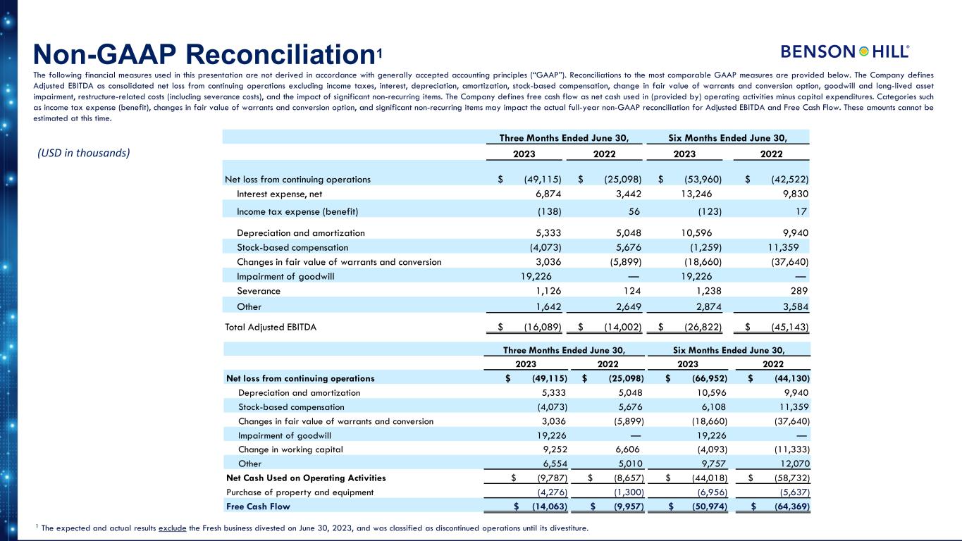 Non-GAAP Reconciliation1 (USD in thousands) 1 The expected and actual results exclude the Fresh business divested on June 30, 2023, and was classified as discontinued operations until its divestiture. The following financial measures used in this presentation are not derived in accordance with generally accepted accounting principles (“GAAP”). Reconciliations to the most comparable GAAP measures are provided below. The Company defines Adjusted EBITDA as consolidated net loss from continuing operations excluding income taxes, interest, depreciation, amortization, stock-based compensation, change in fair value of warrants and conversion option, goodwill and long-lived asset impairment, restructure-related costs (including severance costs), and the impact of significant non-recurring items. The Company defines free cash flow as net cash used in (provided by) operating activities minus capital expenditures. Categories such as income tax expense (benefit), changes in fair value of warrants and conversion option, and significant non-recurring items may impact the actual full-year non-GAAP reconciliation for Adjusted EBITDA and Free Cash Flow. These amounts cannot be estimated at this time. Three Months Ended June 30, Six Months Ended June 30, 2023 2022 2023 2022 Net loss from continuing operations $ (49,115) $ (25,098) $ (66,952) $ (44,130) Depreciation and amortization 5,333 5,048 10,596 9,940 Stock-based compensation (4,073) 5,676 6,108 11,359 Changes in fair value of warrants and conversion 3,036 (5,899) (18,660) (37,640) Impairment of goodwill 19,226 — 19,226 — Change in working capital 9,252 6,606 (4,093) (11,333) Other 6,554 5,010 9,757 12,070 Net Cash Used on Operating Activities $ (9,787) $ (8,657) $ (44,018) $ (58,732) Purchase of property and equipment (4,276) (1,300) (6,956) (5,637) Free Cash Flow $ (14,063) $ (9,957) $ (50,974) $ (64,369) Three Months Ended June 30, Six Months Ended June 30, 2023 2022 2023 2022 Net loss from continuing operations $ (49,115) $ (25,098) $ (53,960) $ (42,522) Interest expense, net 6,874 3,442 13,246 9,830 Income tax expense (benefit) (138) 56 (123) 17 Depreciation and amortization 5,333 5,048 10,596 9,940 Stock-based compensation (4,073) 5,676 (1,259) 11,359 Changes in fair value of warrants and conversion 3,036 (5,899) (18,660) (37,640) Impairment of goodwill 19,226 — 19,226 — Severance 1,126 124 1,238 289 Other 1,642 2,649 2,874 3,584 Total Adjusted EBITDA $ (16,089) $ (14,002) $ (26,822) $ (45,143)