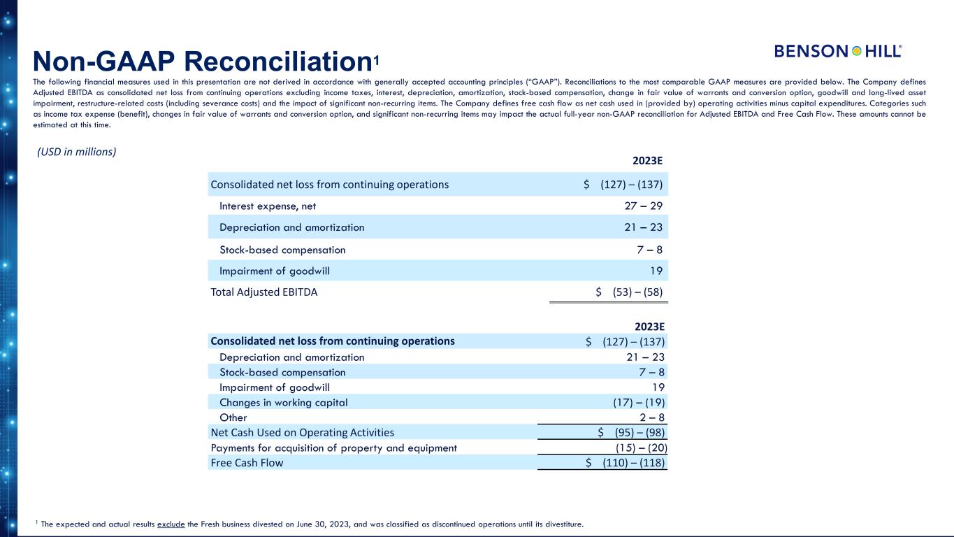 Non-GAAP Reconciliation1 (USD in millions) 2023E Consolidated net loss from continuing operations $ (127) – (137) Interest expense, net 27 – 29 Depreciation and amortization 21 – 23 Stock-based compensation 7 – 8 Impairment of goodwill 19 Total Adjusted EBITDA $ (53) – (58) 2023E Consolidated net loss from continuing operations $ (127) – (137) Depreciation and amortization 21 – 23 Stock-based compensation 7 – 8 Impairment of goodwill 19 Changes in working capital (17) – (19) Other 2 – 8 Net Cash Used on Operating Activities $ (95) – (98) Payments for acquisition of property and equipment (15) – (20) Free Cash Flow $ (110) – (118) The following financial measures used in this presentation are not derived in accordance with generally accepted accounting principles (“GAAP”). Reconciliations to the most comparable GAAP measures are provided below. The Company defines Adjusted EBITDA as consolidated net loss from continuing operations excluding income taxes, interest, depreciation, amortization, stock-based compensation, change in fair value of warrants and conversion option, goodwill and long-lived asset impairment, restructure-related costs (including severance costs) and the impact of significant non-recurring items. The Company defines free cash flow as net cash used in (provided by) operating activities minus capital expenditures. Categories such as income tax expense (benefit), changes in fair value of warrants and conversion option, and significant non-recurring items may impact the actual full-year non-GAAP reconciliation for Adjusted EBITDA and Free Cash Flow. These amounts cannot be estimated at this time. 1 The expected and actual results exclude the Fresh business divested on June 30, 2023, and was classified as discontinued operations until its divestiture.