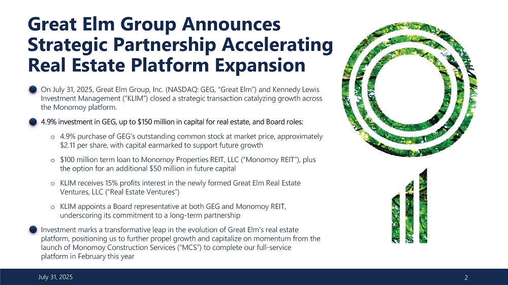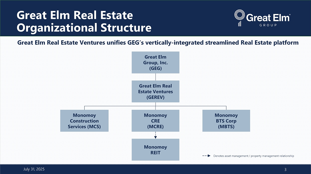 • On July 31, 2025, Great Elm Group, Inc. (NASDAQ: GEG, “Great Elm”) and Kennedy Lewis Investment Management (“KLIM”) closed a strategic transaction catalyzing growth across the Monomoy platform. • 4.9% investment in GEG, up to $150 million in capital for real estate, and Board roles: o 4.9% purchase of GEG’s outstanding common stock at market price, approximately $2.11 per share, with capital earmarked to support future growth o $100 million term loan to Monomoy Properties REIT, LLC (“Monomoy REIT”), plus the option for an additional $50 million in future capital o KLIM receives 15% profits interest in the newly formed Great Elm Real Estate Ventures, LLC (“Real Estate Ventures”) o KLIM appoints a Board representative at both GEG and Monomoy REIT, underscoring its commitment to a long - term partnership ▪ Investment marks a transformative leap in the evolution of Great Elm’s real estate platform, positioning us to further propel growth and capitalize on momentum from the launch of Monomoy Construction Services (“MCS”) to complete our full - service platform in February this year Great Elm Group Announces Strategic Partnership Accelerating Real Estate Platform Expansion March 2023 ©2023 Great Elm Capital Corp. 2 July 31 , 2025 2