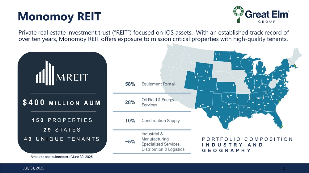 Great Elm Real Estate Organizational Structure Great Elm Real Estate Ventures unifies GEG’s vertically - integrated streamlined Real Estate platform Great Elm Real Estate Ventures (GEREV) Monomoy CRE (MCRE) Monomoy Construction Services (MCS) Monomoy BTS Corp (MBTS) 3 Great Elm Group, Inc. (GEG) Monomoy REIT July 31 , 2025 Denotes asset management / property management relationship