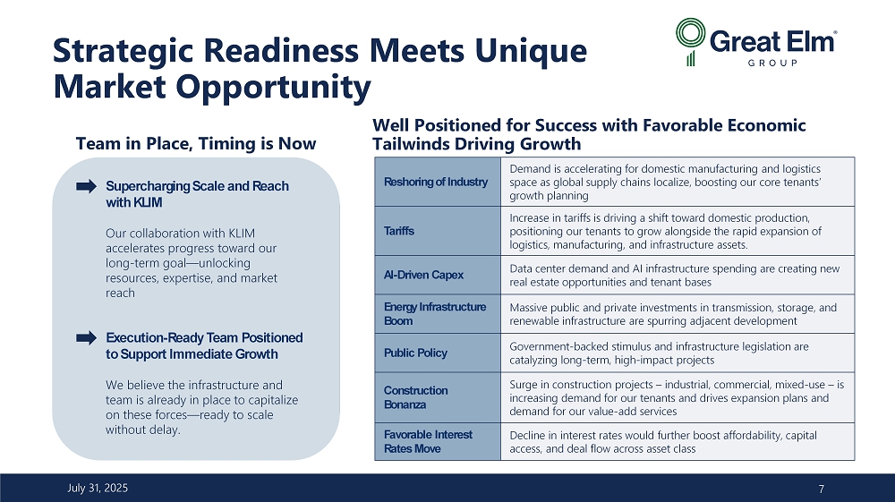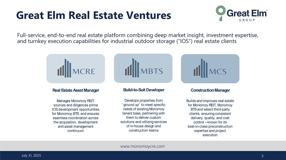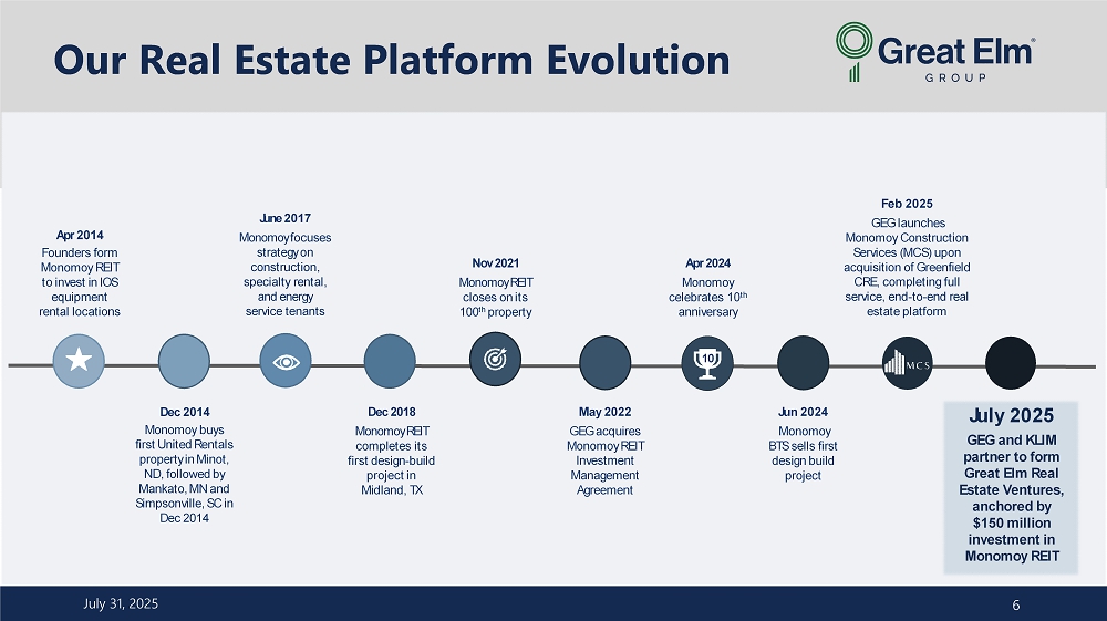 Our Real Estate Platform Evolution 6 May 2022 GEG acquires Monomoy REIT Investment Management Agreement Apr 2014 Founders form Monomoy REIT to invest in I OS equipment rental locations June 2017 Monomoy focuses strategy on construction, specialty rental, an d energy service tenants Jun 2024 Monomoy BTS sells first design build project 10 Feb 2025 GEG launches Monomoy Construction Services (MCS) upon acquisition of Greenfield CRE, completing full service, end - to - end real estate platform Dec 2014 Monomoy buys first United Rentals property in Minot, ND, followed by Mankato, MN and Simpsonville, SC in Dec 2014 Dec 2018 Monomoy REIT completes its first design - build project in Midland, TX Nov 2021 Monomoy REIT closes on its 100 th property Apr 2024 Monomoy celebrates 10 th anniversary July 2025 GEG and KLIM partner to form Great Elm Real Estate Ventures, anchored by $150 million investment in Monomoy REIT July 31 , 2025