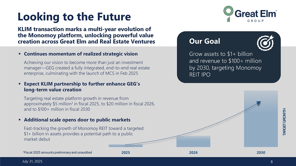 Strategic Readiness Meets Unique Market Opportunity 7 Well Positioned for Success with Favorable Economic Tailwinds Driving Growth Demand is accelerating for domestic manufacturing and logistics space as global supply chains localize, boosting our core tenants’ growth planning Reshoring of Industry Increase in tariffs is driving a shift toward domestic production, positioning our tenants to grow alongside the rapid expansion of logistics, manufacturing, and infrastructure assets. Tariffs Data center demand and AI infrastructure spending are creating new real estate opportunities and tenant bases AI - Driven Capex Massive public and private investments in transmission, storage, and renewable infrastructure are spurring adjacent development Energy Infrastructure Boom Government - backed stimulus and infrastructure legislation are catalyzing long - term, high - impact projects Public Policy Surge in construction projects – industrial, commercial, mixed - use – is increasing demand for our tenants and drives expansion plans and demand for our value - add services Construction Bonanza Decline in interest rates would further boost affordability, capital access, and deal flow across asset class Favorable Interest Rates Move Team in Place, Timing is Now July 31 , 2025 ▪ Supercharging Scale and Reach with KLIM Our collaboration with KLIM accelerates progress toward our long - term goal — unlocking resources, expertise, and market reach ▪ Execution - Ready Team Positioned to Support Immediate Growth We believe the infrastructure and team is already in place to capitalize on these forces — ready to scale without delay.