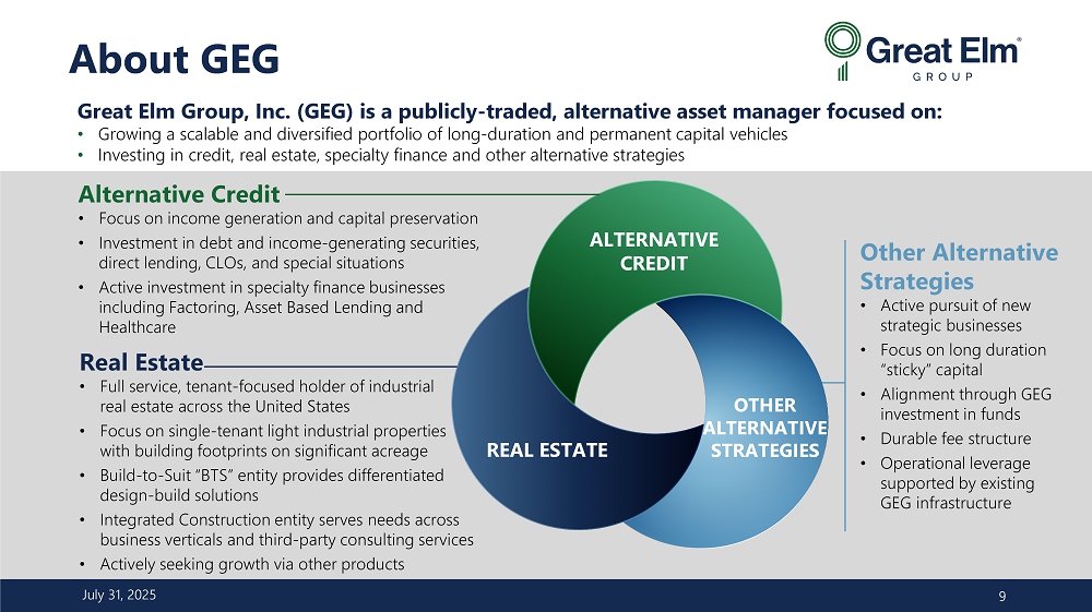 9 About GEG Great Elm Group, Inc. (GEG) is a publicly - traded, alternative asset manager focused on: • Growing a scalable and diversified portfolio of long - duration and permanent capital vehicles • Investing in credit, real estate, specialty finance and other alternative strategies Alternative Credit • Focus on income generation and capital preservation • Investment in debt and income - generating securities, direct lending, CLOs, and special situations • Active investment in specialty finance businesses including Factoring, Asset Based Lending and Healthcare Real Estate • Full service, tenant - focused holder of industrial real estate across the United States • Focus on single - tenant light industrial properties with building footprints on significant acreage • Build - to - Suit “BTS” entity provides differentiated design - build solutions • Integrated Construction entity serves needs across business verticals and third - party consulting services • Actively seeking growth via other products Other Alternative Strategies • Active pursuit of new strategic businesses • Focus on long duration “sticky” capital • Alignment through GEG investment in funds • Durable fee structure • Operational leverage supported by existing GEG infrastructure ALTERNATIVE CREDIT REAL ESTATE OTHER ALTERNATIVE STRATEGIES July 31 , 2025
