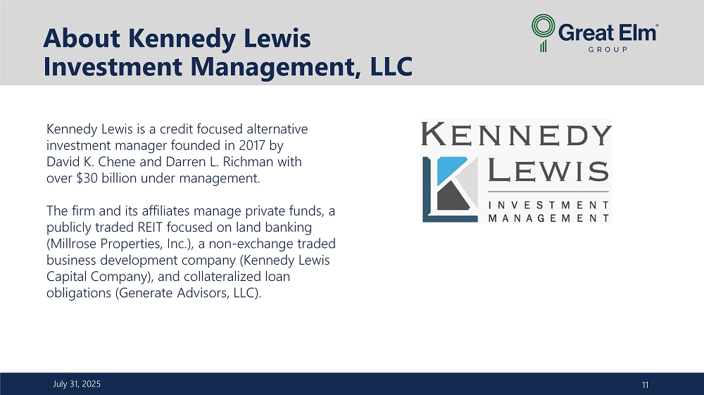 About Kennedy Lewis Investment Management, LLC Kennedy Lewis is a credit focused alternative investment manager founded in 2017 by David K. Chene and Darren L. Richman with over $30 billion under management. The firm and its affiliates manage private funds, a publicly traded REIT focused on land banking (Millrose Properties, Inc.), a non - exchange traded business development company (Kennedy Lewis Capital Company), and collateralized loan obligations (Generate Advisors, LLC). 11 July 31 , 2025