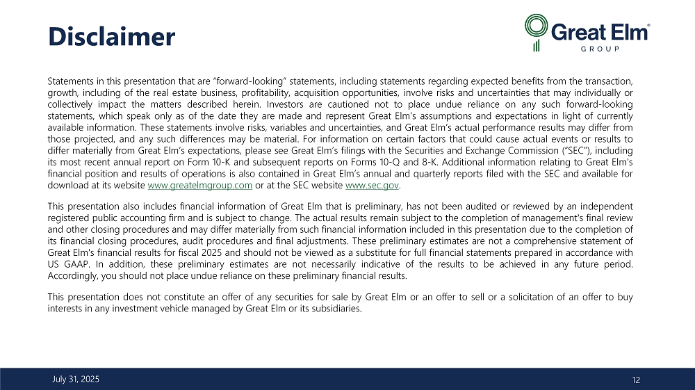 Disclaimer 12 Statements in this presentation that are “forward - looking” statements, including statements regarding expected benefits from the transaction, growth, including of the real estate business, profitability, acquisition opportunities, involve risks and uncertainties that may individually or collectively impact the matters described herein . Investors are cautioned not to place undue reliance on any such forward - looking statements, which speak only as of the date they are made and represent Great Elm’s assumptions and expectations in light of currently available information . These statements involve risks, variables and uncertainties, and Great Elm’s actual performance results may differ from those projected, and any such differences may be material . For information on certain factors that could cause actual events or results to differ materially from Great Elm’s expectations, please see Great Elm’s filings with the Securities and Exchange Commission (“SEC”), including its most recent annual report on Form 10 - K and subsequent reports on Forms 10 - Q and 8 - K . Additional information relating to Great Elm’s financial position and results of operations is also contained in Great Elm’s annual and quarterly reports filed with the SEC and available for download at its website www . greatelmgroup . com or at the SEC website www . sec . gov . This presentation also includes financial information of Great Elm that is preliminary, has not been audited or reviewed by an independent registered public accounting firm and is subject to change . The actual results remain subject to the completion of management's final review and other closing procedures and may differ materially from such financial information included in this presentation due to the completion of its financial closing procedures, audit procedures and final adjustments . These preliminary estimates are not a comprehensive statement of Great Elm's financial results for fiscal 2025 and should not be viewed as a substitute for full financial statements prepared in accordance with US GAAP . In addition, these preliminary estimates are not necessarily indicative of the results to be achieved in any future period . Accordingly, you should not place undue reliance on these preliminary financial results . This presentation does not constitute an offer of any securities for sale by Great Elm or an offer to sell or a solicitation of an offer to buy interests in any investment vehicle managed by Great Elm or its subsidiaries . July 31 , 2025