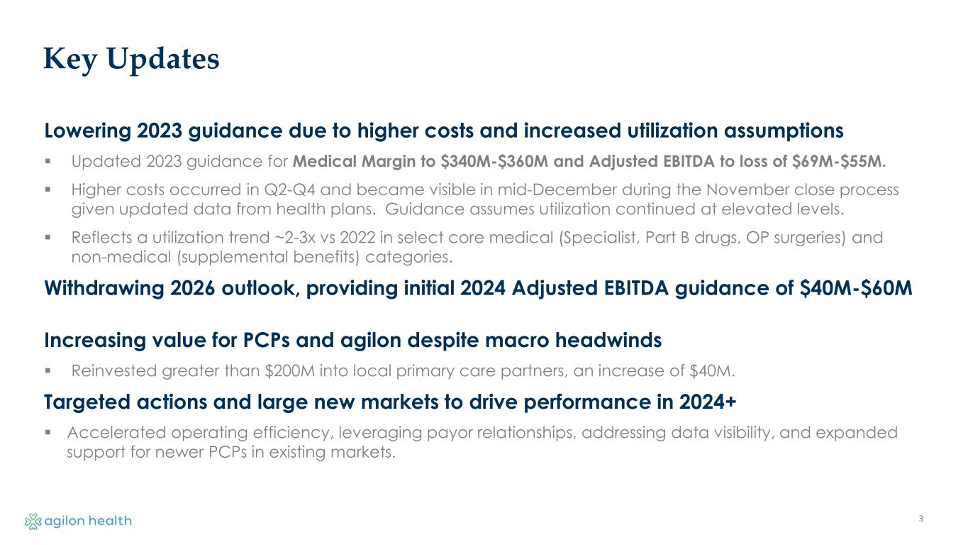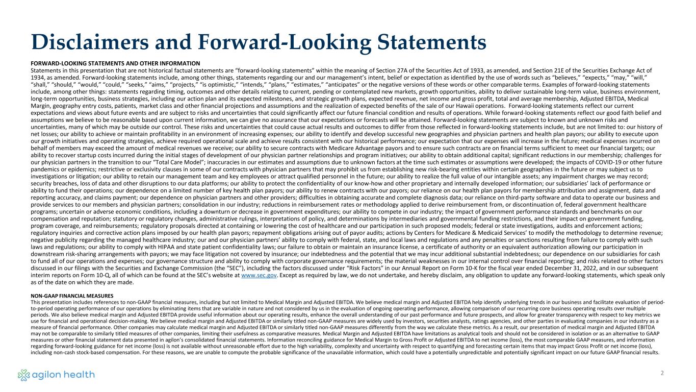2 Disclaimers and Forward-Looking Statements FORWARD-LOOKING STATEMENTS AND OTHER INFORMATION Statements in this presentation that are not historical factual statements are “forward-looking statements” within the meaning of Section 27A of the Securities Act of 1933, as amended, and Section 21E of the Securities Exchange Act of 1934, as amended. Forward-looking statements include, among other things, statements regarding our and our management’s intent, belief or expectation as identified by the use of words such as “believes,” “expects,” “may,” “will,” “shall,” “should,” “would,” “could,” “seeks,” “aims,” “projects,” “is optimistic,” “intends,” “plans,” “estimates,” “anticipates” or the negative versions of these words or other comparable terms. Examples of forward-looking statements include, among other things: statements regarding timing, outcomes and other details relating to current, pending or contemplated new markets, growth opportunities, ability to deliver sustainable long-term value, business environment, long-term opportunities, business strategies, including our action plan and its expected milestones, and strategic growth plans, expected revenue, net income and gross profit, total and average membership, Adjusted EBITDA, Medical Margin, geography entry costs, patients, market class and other financial projections and assumptions and the realization of expected benefits of the sale of our Hawaii operations. Forward-looking statements reflect our current expectations and views about future events and are subject to risks and uncertainties that could significantly affect our future financial condition and results of operations. While forward-looking statements reflect our good faith belief and assumptions we believe to be reasonable based upon current information, we can give no assurance that our expectations or forecasts will be attained. Forward-looking statements are subject to known and unknown risks and uncertainties, many of which may be outside our control. These risks and uncertainties that could cause actual results and outcomes to differ from those reflected in forward-looking statements include, but are not limited to: our history of net losses; our ability to achieve or maintain profitability in an environment of increasing expenses; our ability to identify and develop successful new geographies and physician partners and health plan payors; our ability to execute upon our growth initiatives and operating strategies, achieve required operational scale and achieve results consistent with our historical performance; our expectation that our expenses will increase in the future; medical expenses incurred on behalf of members may exceed the amount of medical revenues we receive; our ability to secure contracts with Medicare Advantage payors and to ensure such contracts are on financial terms sufficient to meet our financial targets; our ability to recover startup costs incurred during the initial stages of development of our physician partner relationships and program initiatives; our ability to obtain additional capital; significant reductions in our membership; challenges for our physician partners in the transition to our “Total Care Model”; inaccuracies in our estimates and assumptions due to unknown factors at the time such estimates or assumptions were developed; the impacts of COVID-19 or other future pandemics or epidemics; restrictive or exclusivity clauses in some of our contracts with physician partners that may prohibit us from establishing new risk-bearing entities within certain geographies in the future or may subject us to investigations or litigation; our ability to retain our management team and key employees or attract qualified personnel in the future; our ability to realize the full value of our intangible assets; any impairment charges we may record; security breaches, loss of data and other disruptions to our data platforms; our ability to protect the confidentiality of our know-how and other proprietary and internally developed information; our subsidiaries’ lack of performance or ability to fund their operations; our dependence on a limited number of key health plan payors; our ability to renew contracts with our payors; our reliance on our health plan payors for membership attribution and assignment, data and reporting accuracy, and claims payment; our dependence on physician partners and other providers; difficulties in obtaining accurate and complete diagnosis data; our reliance on third-party software and data to operate our business and provide services to our members and physician partners; consolidation in our industry; reductions in reimbursement rates or methodology applied to derive reimbursement from, or discontinuation of, federal government healthcare programs; uncertain or adverse economic conditions, including a downturn or decrease in government expenditures; our ability to compete in our industry; the impact of government performance standards and benchmarks on our compensation and reputation; statutory or regulatory changes, administrative rulings, interpretations of policy, and determinations by intermediaries and governmental funding restrictions, and their impact on government funding, program coverage, and reimbursements; regulatory proposals directed at containing or lowering the cost of healthcare and our participation in such proposed models; federal or state investigations, audits and enforcement actions; regulatory inquiries and corrective action plans imposed by our health plan payors; repayment obligations arising out of payor audits; actions by Centers for Medicare & Medicaid Services’ to modify the methodology to determine revenue; negative publicity regarding the managed healthcare industry; our and our physician partners’ ability to comply with federal, state, and local laws and regulations and any penalties or sanctions resulting fro
