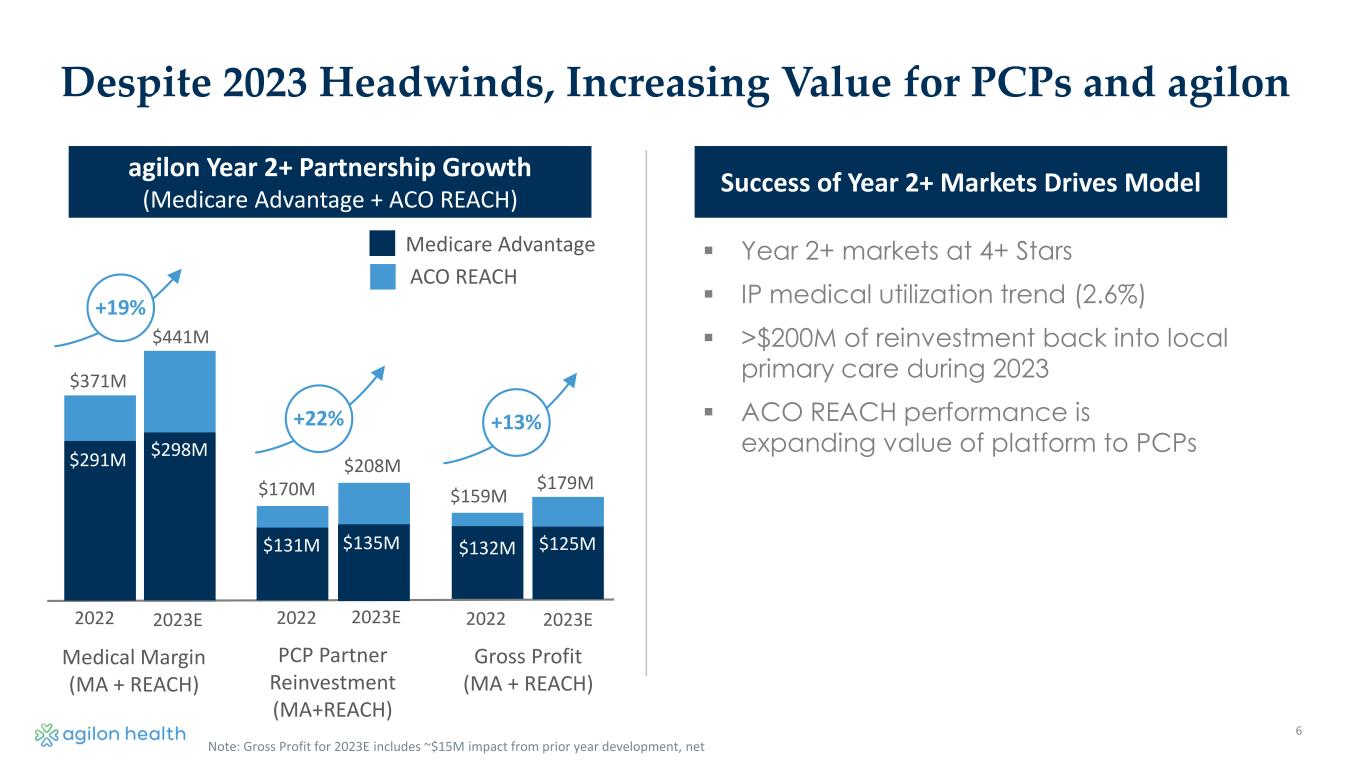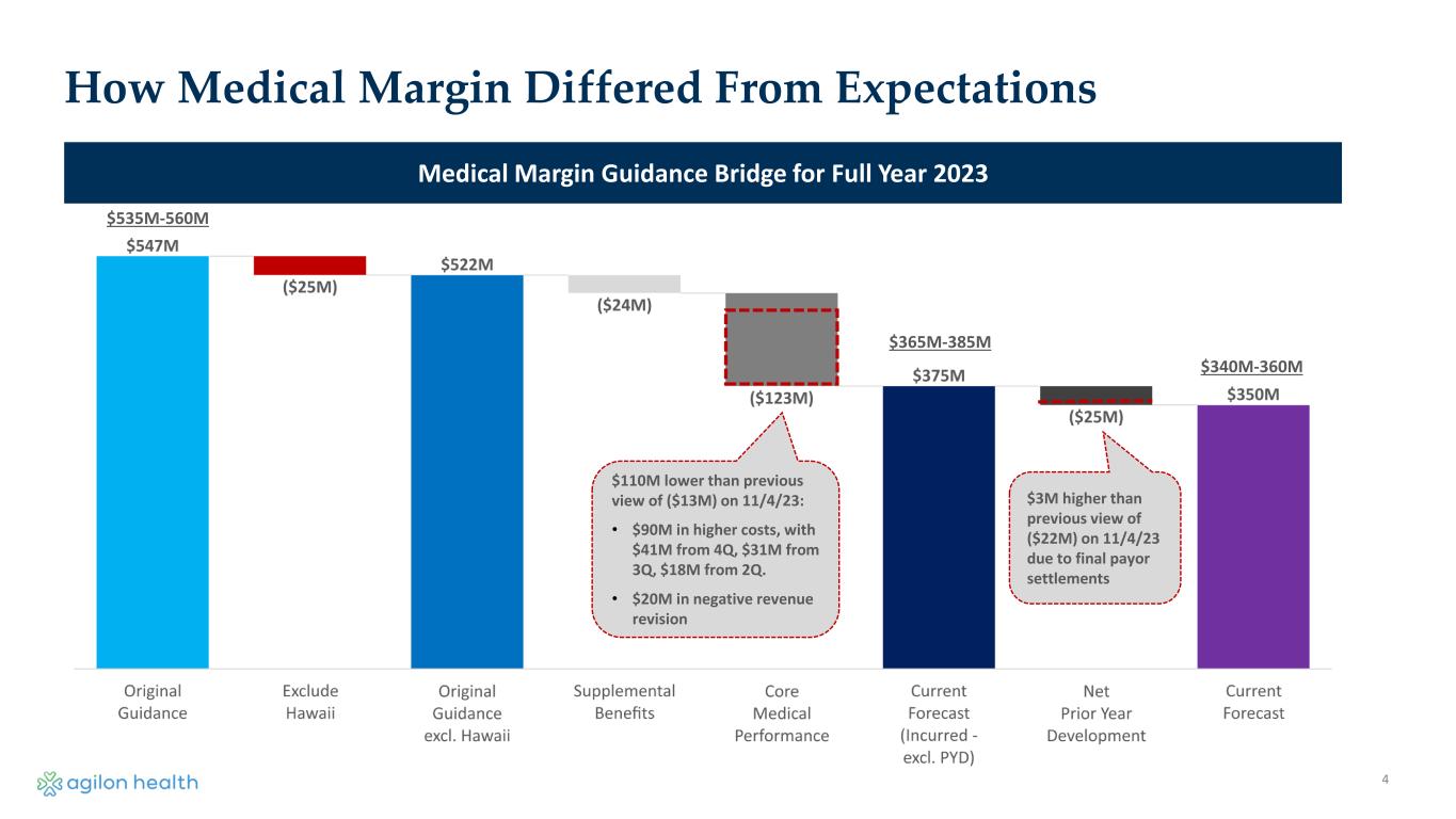 3 Key Updates Lowering 2023 guidance due to higher costs and increased utilization assumptions ▪ Updated 2023 guidance for Medical Margin to $340M-$360M and Adjusted EBITDA to loss of $69M-$55M. ▪ Higher costs occurred in Q2-Q4 and became visible in mid-December during the November close process given updated data from health plans. Guidance assumes utilization continued at elevated levels. ▪ Reflects a utilization trend ~2-3x vs 2022 in select core medical (Specialist, Part B drugs, OP surgeries) and non-medical (supplemental benefits) categories. Withdrawing 2026 outlook, providing initial 2024 Adjusted EBITDA guidance of $40M-$60M Increasing value for PCPs and agilon despite macro headwinds ▪ Reinvested greater than $200M into local primary care partners, an increase of $40M. Targeted actions and large new markets to drive performance in 2024+ ▪ Accelerated operating efficiency, leveraging payor relationships, addressing data visibility, and expanded support for newer PCPs in existing markets.