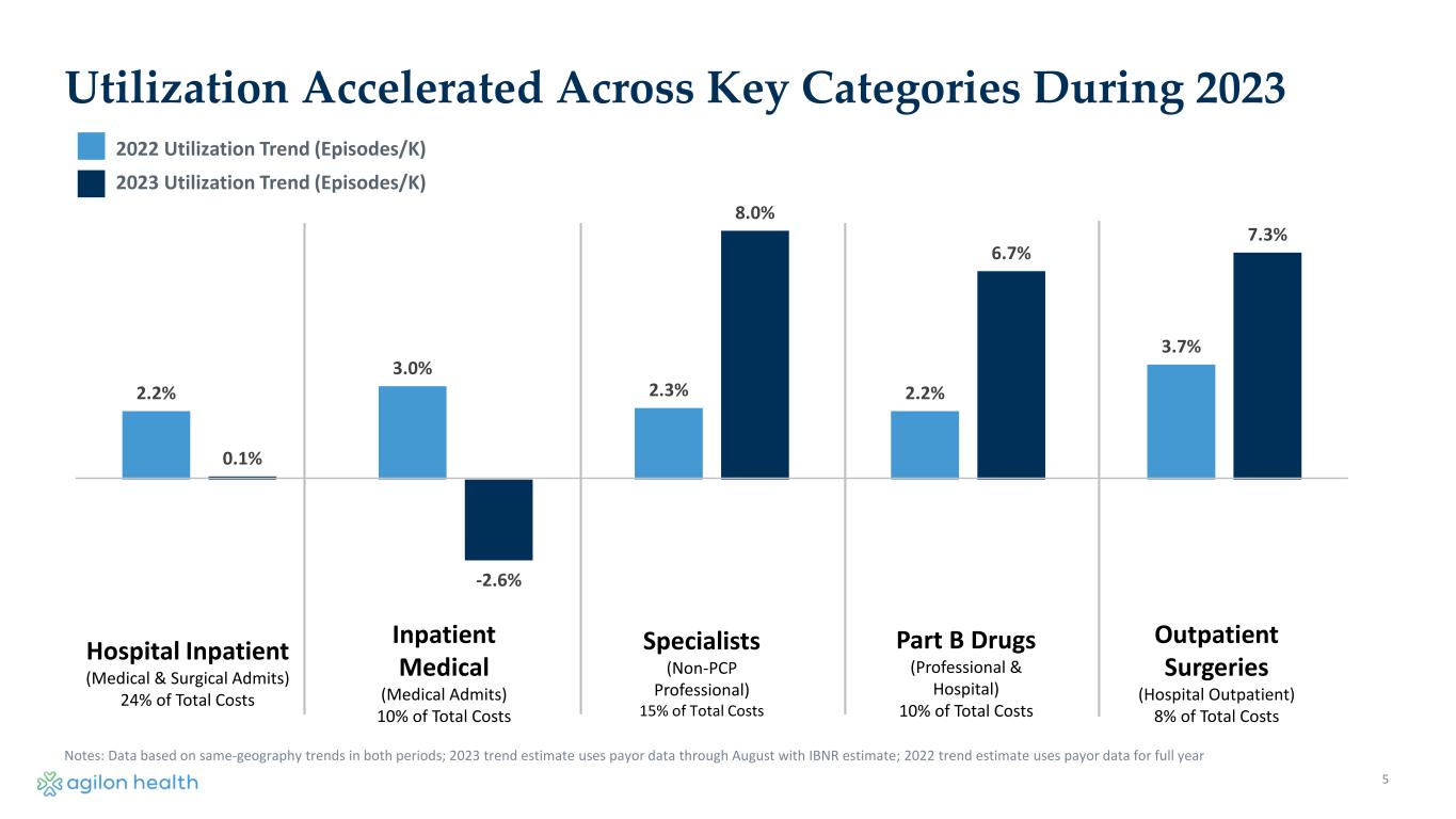 4 $535M-560M $340M-360M $365M-385M How Medical Margin Differed From Expectations $110M lower than previous view of ($13M) on 11/4/23: • $90M in higher costs, with $41M from 4Q, $31M from 3Q, $18M from 2Q. • $20M in negative revenue revision Medical Margin Guidance Bridge for Full Year 2023 $3M higher than previous view of ($22M) on 11/4/23 due to final payor settlements