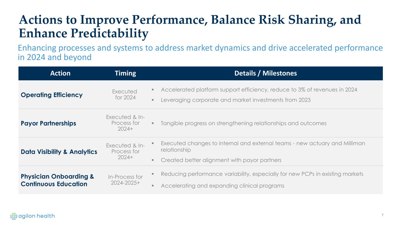 6 Despite 2023 Headwinds, Increasing Value for PCPs and agilon agilon Year 2+ Partnership Growth (Medicare Advantage + ACO REACH) Success of Year 2+ Markets Drives Model Medical Margin (MA + REACH) Gross Profit (MA + REACH) ▪ Year 2+ markets at 4+ Stars ▪ IP medical utilization trend (2.6%) ▪ >$200M of reinvestment back into local primary care during 2023 ▪ ACO REACH performance is expanding value of platform to PCPs $371M $441M $159M $179M PCP Partner Reinvestment (MA+REACH) $170M $208M 2022 2023E 2022 2023E 2022 2023E +22% +13% +19% Medicare Advantage ACO REACH $291M $298M $131M $135M $132M $125M Note: Gross Profit for 2023E includes ~$15M impact from prior year development, net