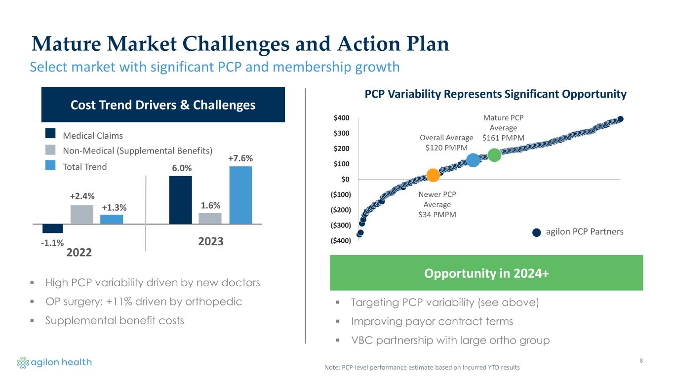 Enhancing processes and systems to address market dynamics and drive accelerated performance in 2024 and beyond Actions to Improve Performance, Balance Risk Sharing, and Enhance Predictability Action Timing Details / Milestones Operating Efficiency Executed for 2024 ▪ Accelerated platform support efficiency, reduce to 3% of revenues in 2024 ▪ Leveraging corporate and market investments from 2023 Payor Partnerships Executed & In- Process for 2024+ ▪ Tangible progress on strengthening relationships and outcomes Data Visibility & Analytics Executed & In- Process for 2024+ ▪ Executed changes to internal and external teams - new actuary and Milliman relationship ▪ Created better alignment with payor partners Physician Onboarding & Continuous Education In-Process for 2024-2025+ ▪ Reducing performance variability, especially for new PCPs in existing markets ▪ Accelerating and expanding clinical programs 7