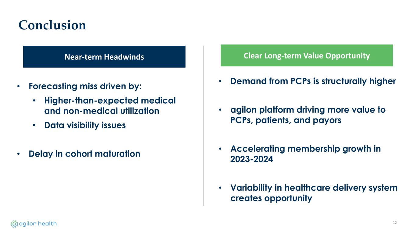 12 Conclusion • Demand from PCPs is structurally higher • agilon platform driving more value to PCPs, patients, and payors • Accelerating membership growth in 2023-2024 • Variability in healthcare delivery system creates opportunity Clear Long-term Value OpportunityNear-term Headwinds • Forecasting miss driven by: • Higher-than-expected medical and non-medical utilization • Data visibility issues • Delay in cohort maturation