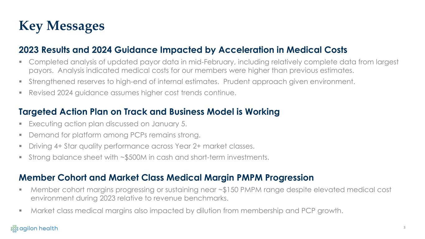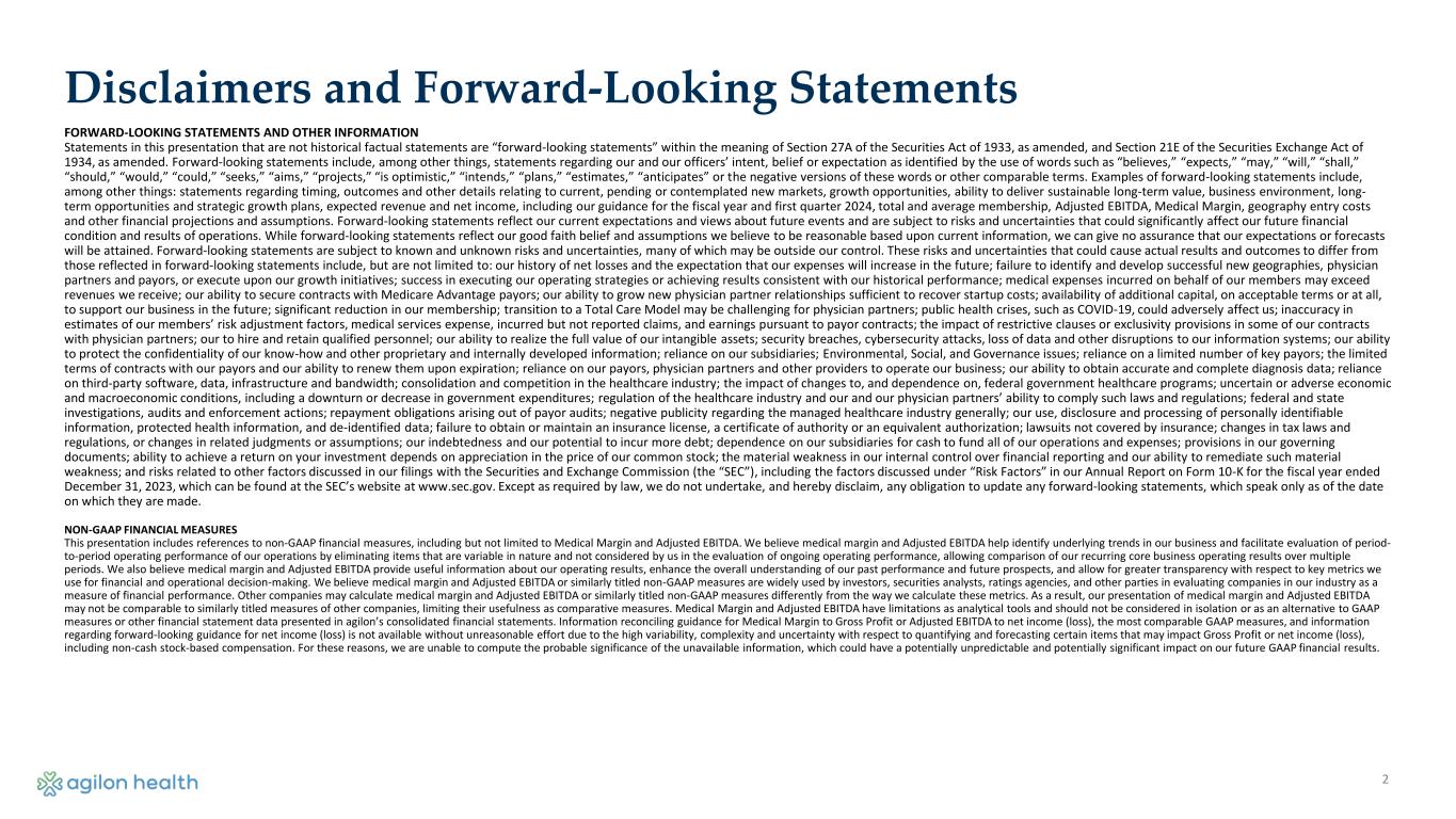 2 Disclaimers and Forward-Looking Statements FORWARD-LOOKING STATEMENTS AND OTHER INFORMATION Statements in this presentation that are not historical factual statements are “forward-looking statements” within the meaning of Section 27A of the Securities Act of 1933, as amended, and Section 21E of the Securities Exchange Act of 1934, as amended. Forward-looking statements include, among other things, statements regarding our and our officers’ intent, belief or expectation as identified by the use of words such as “believes,” “expects,” “may,” “will,” “shall,” “should,” “would,” “could,” “seeks,” “aims,” “projects,” “is optimistic,” “intends,” “plans,” “estimates,” “anticipates” or the negative versions of these words or other comparable terms. Examples of forward-looking statements include, among other things: statements regarding timing, outcomes and other details relating to current, pending or contemplated new markets, growth opportunities, ability to deliver sustainable long-term value, business environment, long- term opportunities and strategic growth plans, expected revenue and net income, including our guidance for the fiscal year and first quarter 2024, total and average membership, Adjusted EBITDA, Medical Margin, geography entry costs and other financial projections and assumptions. Forward-looking statements reflect our current expectations and views about future events and are subject to risks and uncertainties that could significantly affect our future financial condition and results of operations. While forward-looking statements reflect our good faith belief and assumptions we believe to be reasonable based upon current information, we can give no assurance that our expectations or forecasts will be attained. Forward-looking statements are subject to known and unknown risks and uncertainties, many of which may be outside our control. These risks and uncertainties that could cause actual results and outcomes to differ from those reflected in forward-looking statements include, but are not limited to: our history of net losses and the expectation that our expenses will increase in the future; failure to identify and develop successful new geographies, physician partners and payors, or execute upon our growth initiatives; success in executing our operating strategies or achieving results consistent with our historical performance; medical expenses incurred on behalf of our members may exceed revenues we receive; our ability to secure contracts with Medicare Advantage payors; our ability to grow new physician partner relationships sufficient to recover startup costs; availability of additional capital, on acceptable terms or at all, to support our business in the future; significant reduction in our membership; transition to a Total Care Model may be challenging for physician partners; public health crises, such as COVID-19, could adversely affect us; inaccuracy in estimates of our members’ risk adjustment factors, medical services expense, incurred but not reported claims, and earnings pursuant to payor contracts; the impact of restrictive clauses or exclusivity provisions in some of our contracts with physician partners; our to hire and retain qualified personnel; our ability to realize the full value of our intangible assets; security breaches, cybersecurity attacks, loss of data and other disruptions to our information systems; our ability to protect the confidentiality of our know-how and other proprietary and internally developed information; reliance on our subsidiaries; Environmental, Social, and Governance issues; reliance on a limited number of key payors; the limited terms of contracts with our payors and our ability to renew them upon expiration; reliance on our payors, physician partners and other providers to operate our business; our ability to obtain accurate and complete diagnosis data; reliance on third-party software, data, infrastructure and bandwidth; consolidation and competition in the healthcare industry; the impact of changes to, and dependence on, federal government healthcare programs; uncertain or adverse economic and macroeconomic conditions, including a downturn or decrease in government expenditures; regulation of the healthcare industry and our and our physician partners’ ability to comply such laws and regulations; federal and state investigations, audits and enforcement actions; repayment obligations arising out of payor audits; negative publicity regarding the managed healthcare industry generally; our use, disclosure and processing of personally identifiable information, protected health information, and de-identified data; failure to obtain or maintain an insurance license, a certificate of authority or an equivalent authorization; lawsuits not covered by insurance; changes in tax laws and regulations, or changes in related judgments or assumptions; our indebtedness and our potential to incur more debt; dependence on our subsidiaries for cash to fund all of our operations and expenses; provisions in our governing documents; ability to achieve a return on your investment depends on appreciation in the price of our common stock; the material weakness in our internal control over financial reporting and our ability to remediate such material weakness; and risks related to other factors discussed in our filings with the Securities and Exchange Commission (the “SEC”), including the factors discussed under “Risk Factors” in our Annual Report on Form 10-K for the fiscal year ended December 31, 2023, which can be found at the SEC’s website at www.sec.gov. Except as required by law, we do not undertake, and hereby disclaim, any obligation to update any forward-looking statements, which speak only as of the date on which they are made. NON-GAAP FINANCIAL MEASURES This presentation includes references to non‐GAAP financial measures, including but not limited to Medic