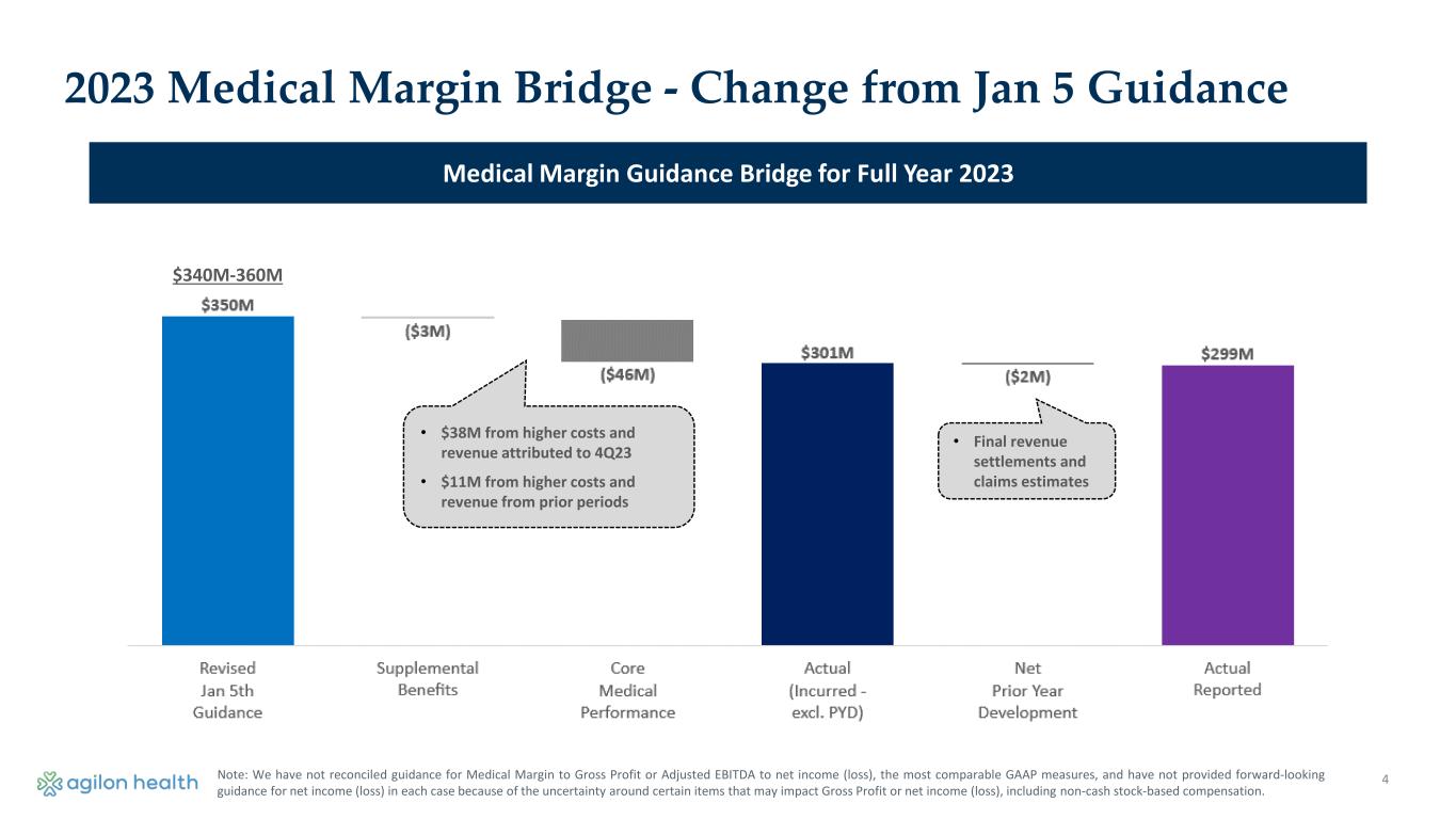 3 Key Messages 2023 Results and 2024 Guidance Impacted by Acceleration in Medical Costs ▪ Completed analysis of updated payor data in mid-February, including relatively complete data from largest payors. Analysis indicated medical costs for our members were higher than previous estimates. ▪ Strengthened reserves to high-end of internal estimates. Prudent approach given environment. ▪ Revised 2024 guidance assumes higher cost trends continue. Targeted Action Plan on Track and Business Model is Working ▪ Executing action plan discussed on January 5. ▪ Demand for platform among PCPs remains strong. ▪ Driving 4+ Star quality performance across Year 2+ market classes. ▪ Strong balance sheet with ~$500M in cash and short-term investments. Member Cohort and Market Class Medical Margin PMPM Progression ▪ Member cohort margins progressing or sustaining near ~$150 PMPM range despite elevated medical cost environment during 2023 relative to revenue benchmarks. ▪ Market class medical margins also impacted by dilution from membership and PCP growth.