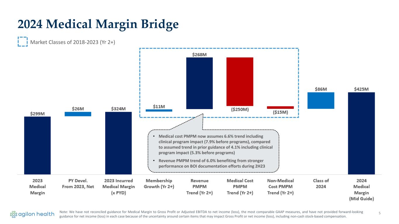 4 2023 Medical Margin Bridge - Change from Jan 5 Guidance • $38M from higher costs and revenue attributed to 4Q23 • $11M from higher costs and revenue from prior periods Medical Margin Guidance Bridge for Full Year 2023 • Final revenue settlements and claims estimates $340M-360M Note: We have not reconciled guidance for Medical Margin to Gross Profit or Adjusted EBITDA to net income (loss), the most comparable GAAP measures, and have not provided forward-looking guidance for net income (loss) in each case because of the uncertainty around certain items that may impact Gross Profit or net income (loss), including non-cash stock-based compensation.