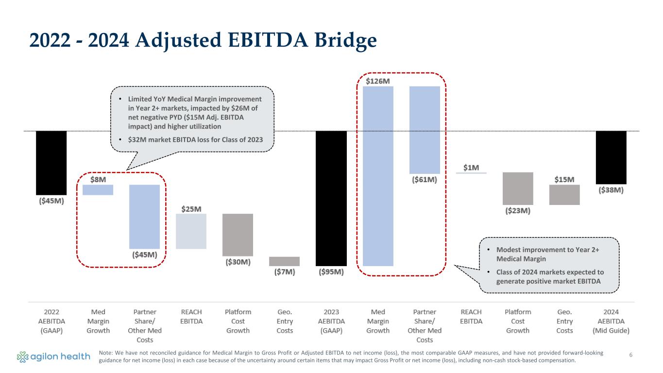 5 2024 Medical Margin Bridge Market Classes of 2018-2023 (Yr 2+) Note: We have not reconciled guidance for Medical Margin to Gross Profit or Adjusted EBITDA to net income (loss), the most comparable GAAP measures, and have not provided forward-looking guidance for net income (loss) in each case because of the uncertainty around certain items that may impact Gross Profit or net income (loss), including non-cash stock-based compensation. • Medical cost PMPM now assumes 6.6% trend including clinical program impact (7.9% before programs), compared to assumed trend in prior guidance of 4.1% including clinical program impact (5.3% before programs) • Revenue PMPM trend of 6.0% benefiting from stronger performance on BOI documentation efforts during 2H23