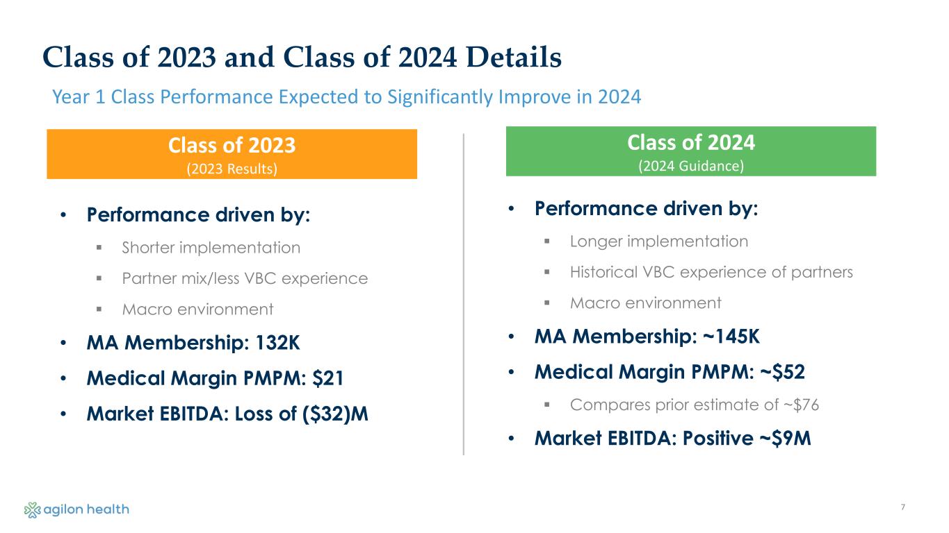 6 2022 - 2024 Adjusted EBITDA Bridge Note: We have not reconciled guidance for Medical Margin to Gross Profit or Adjusted EBITDA to net income (loss), the most comparable GAAP measures, and have not provided forward-looking guidance for net income (loss) in each case because of the uncertainty around certain items that may impact Gross Profit or net income (loss), including non-cash stock-based compensation. • Limited YoY Medical Margin improvement in Year 2+ markets, impacted by $26M of net negative PYD ($15M Adj. EBITDA impact) and higher utilization • $32M market EBITDA loss for Class of 2023 • Modest improvement to Year 2+ Medical Margin • Class of 2024 markets expected to generate positive market EBITDA