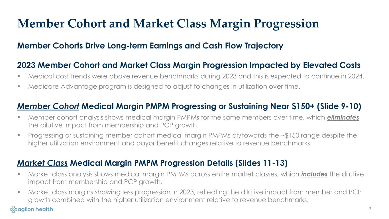 Enhancing processes and systems to address market dynamics and drive accelerated performance in 2024 and beyond Actions to Improve Performance, Balance Risk Sharing, and Enhance Predictability Action Timing Details / Milestones Physician Onboarding & Continuous Education In-Process for 2024-2025+ ▪ Reducing performance variability, especially for new PCPs in existing markets ▪ Accelerating and expanding clinical programs Payor Partnerships Executed & In- Process for 2024+ ▪ Tangible progress on strengthening relationships and outcomes Data Visibility & Analytics Executed & In- Process for 2024+ ▪ Executed changes to internal and external teams - new actuary and Milliman relationship ▪ Created better alignment with payor partners Operating Efficiency Executed for 2024 ▪ Accelerated platform support efficiency, reduce to 3% of revenues in 2024 ▪ Leveraging corporate and market investments from 2023 8