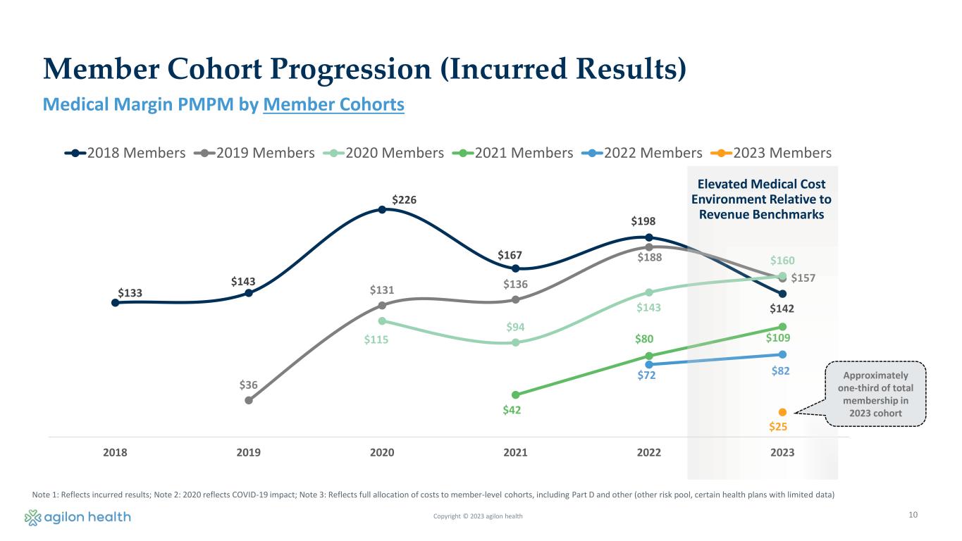 9 Member Cohort and Market Class Margin Progression Member Cohorts Drive Long-term Earnings and Cash Flow Trajectory 2023 Member Cohort and Market Class Margin Progression Impacted by Elevated Costs ▪ Medical cost trends were above revenue benchmarks during 2023 and this is expected to continue in 2024. ▪ Medicare Advantage program is designed to adjust to changes in utilization over time. Member Cohort Medical Margin PMPM Progressing or Sustaining Near $150+ (Slide 9-10) ▪ Member cohort analysis shows medical margin PMPMs for the same members over time, which eliminates the dilutive impact from membership and PCP growth. ▪ Progressing or sustaining member cohort medical margin PMPMs at/towards the ~$150 range despite the higher utilization environment and payor benefit changes relative to revenue benchmarks. Market Class Medical Margin PMPM Progression Details (Slides 11-13) ▪ Market class analysis shows medical margin PMPMs across entire market classes, which includes the dilutive impact from membership and PCP growth. ▪ Market class margins showing less progression in 2023, reflecting the dilutive impact from member and PCP growth combined with the higher utilization environment relative to revenue benchmarks.