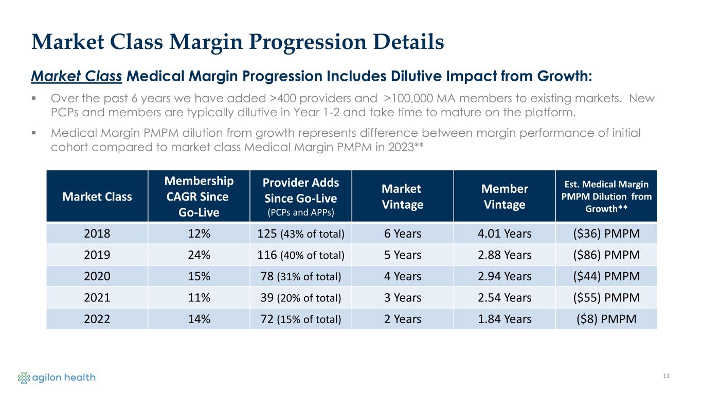 10 $133 $143 $226 $167 $198 $142 $36 $131 $136 $188 $157 $115 $94 $143 $160 $42 $80 $109 $72 $82 $25 2018 2019 2020 2021 2022 2023 2018 Members 2019 Members 2020 Members 2021 Members 2022 Members 2023 Members Note 1: Reflects incurred results; Note 2: 2020 reflects COVID-19 impact; Note 3: Reflects full allocation of costs to member-level cohorts, including Part D and other (other risk pool, certain health plans with limited data) Medical Margin PMPM by Member Cohorts Copyright © 2023 agilon health Member Cohort Progression (Incurred Results) Elevated Medical Cost Environment Relative to Revenue Benchmarks Approximately one-third of total membership in 2023 cohort