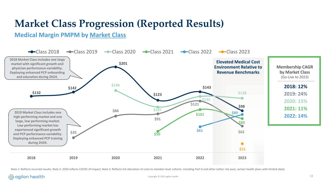 12 $132 $142 $201 $114 $143 $106 $35 $86 $81 $108 $79 $146 $87 $147 $130 $54 $80 $96 $61 $89 $21 2018 2019 2020 2021 2022 2023 Class 2018 Class 2019 Class 2020 Class 2021 Class 2022 Class 2023 Elevated Medical Cost Environment Relative to Revenue Benchmarks 2018: 12% 2019: 24% 2020: 15% 2021: 11% 2022: 14% Membership CAGR by Market Class (Go-Live to 2023) Note 1: Reflects incurred results; Note 2: 2020 reflects COVID-19 impact; Note 3: Reflects full allocation of costs to member-level cohorts, including Part D and other (other risk pool, certain health plans with limited data) Medical Margin PMPM by Market Class Copyright © 2023 agilon health Market Class Progression (Incurred Results) 2018 Market Class includes one large market with significant growth and physician performance variability. Deploying enhanced PCP onboarding and education during 2H24. 2019 Market Class includes one high performing market and one large, low performing market. Low performing market has experienced significant growth and PCP performance variability. Deploying enhanced PCP training during 2H24.